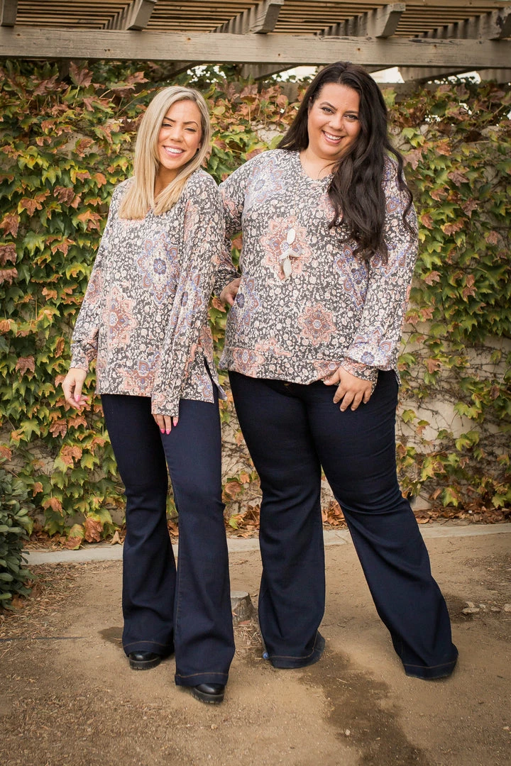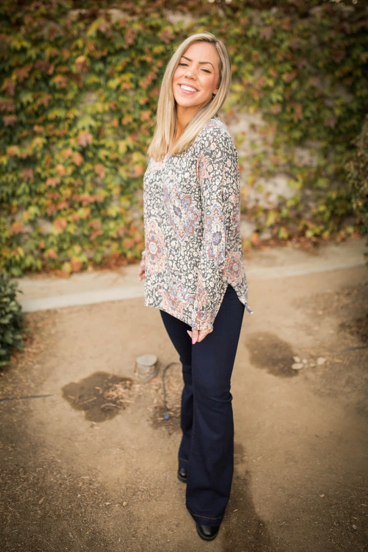 This mosaic printed long sleeve top is sure to turn heads. Featuring long sleeves, a v-neck and side slit hem and sleeves.