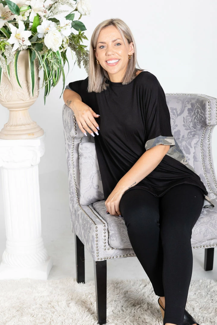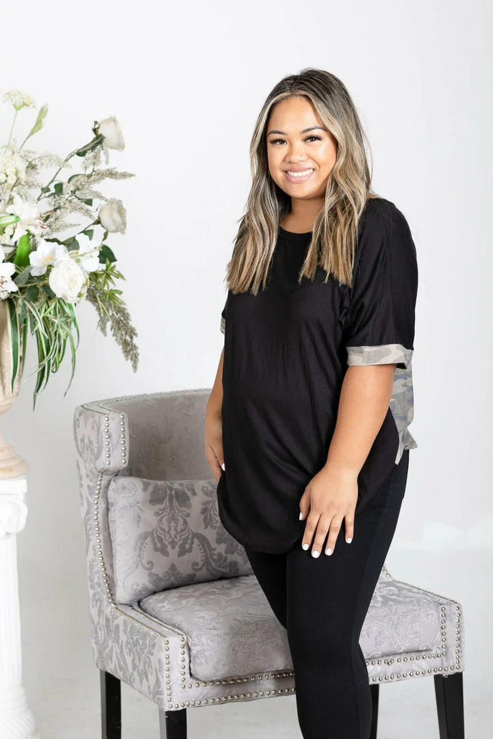 This fun camo tunic is perfect to wear with just about anything. With a relaxed fit, this top features a round neckline, short cuffed sleeves, scoop back with cross details and hi low hem.