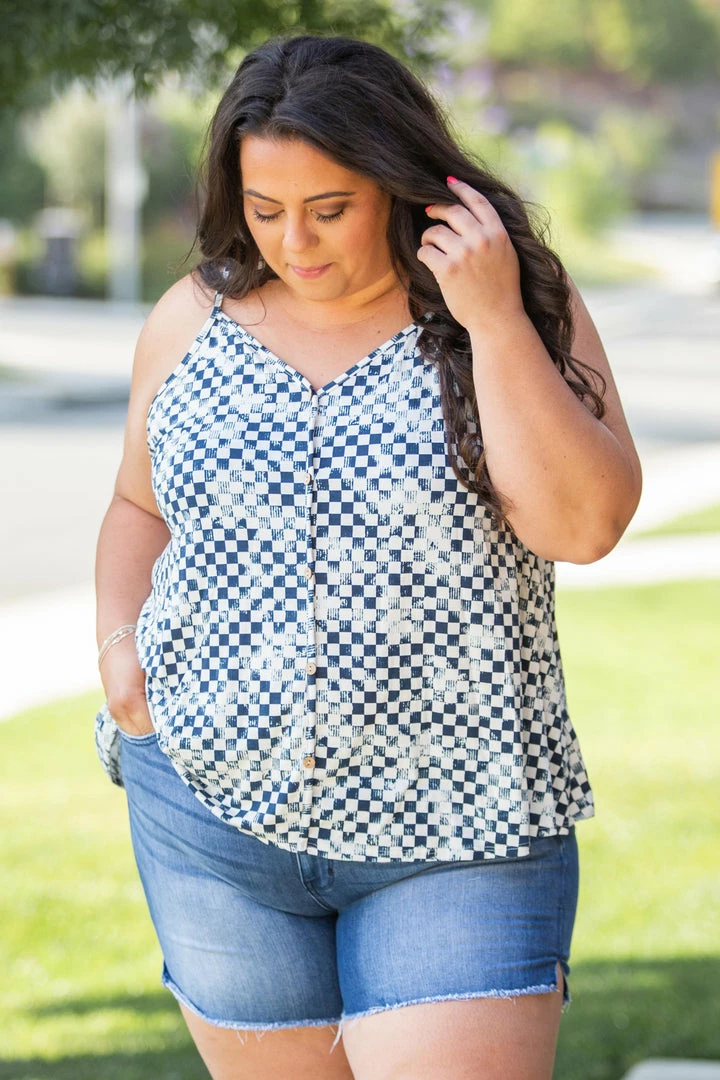 This navy and white checkered cami has us ready to go to the raceway. Made from the softest jersey fabric, this top features a button down front detail (non functioning buttons, so no need to worry about the girls peeking out), a v-neck and flare hem.