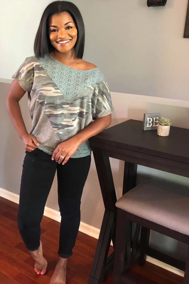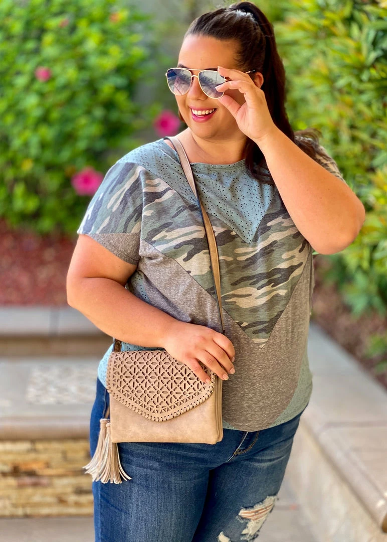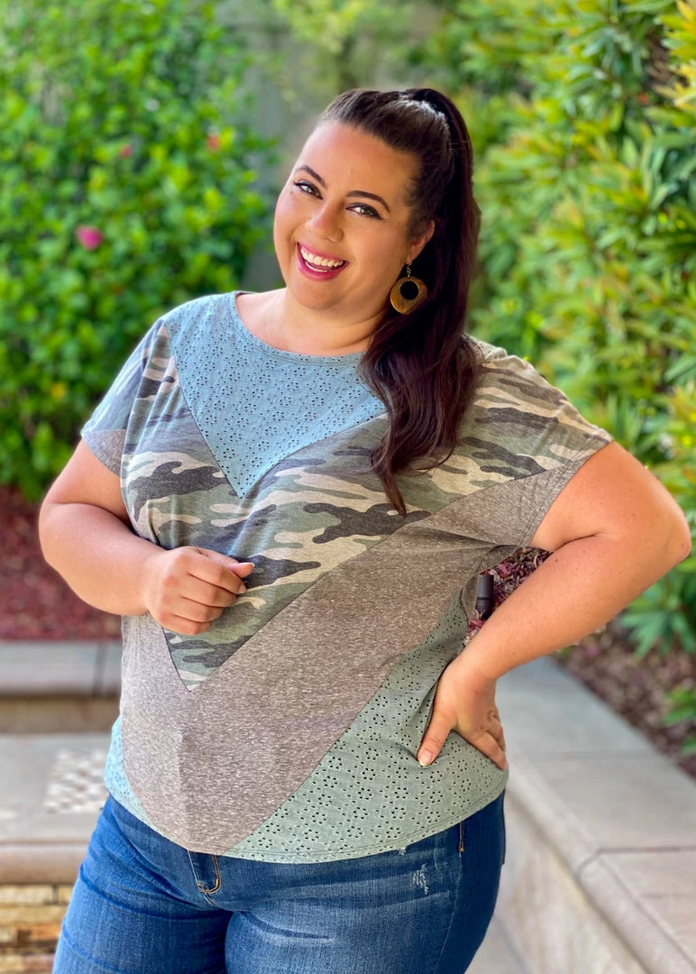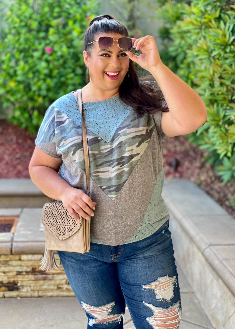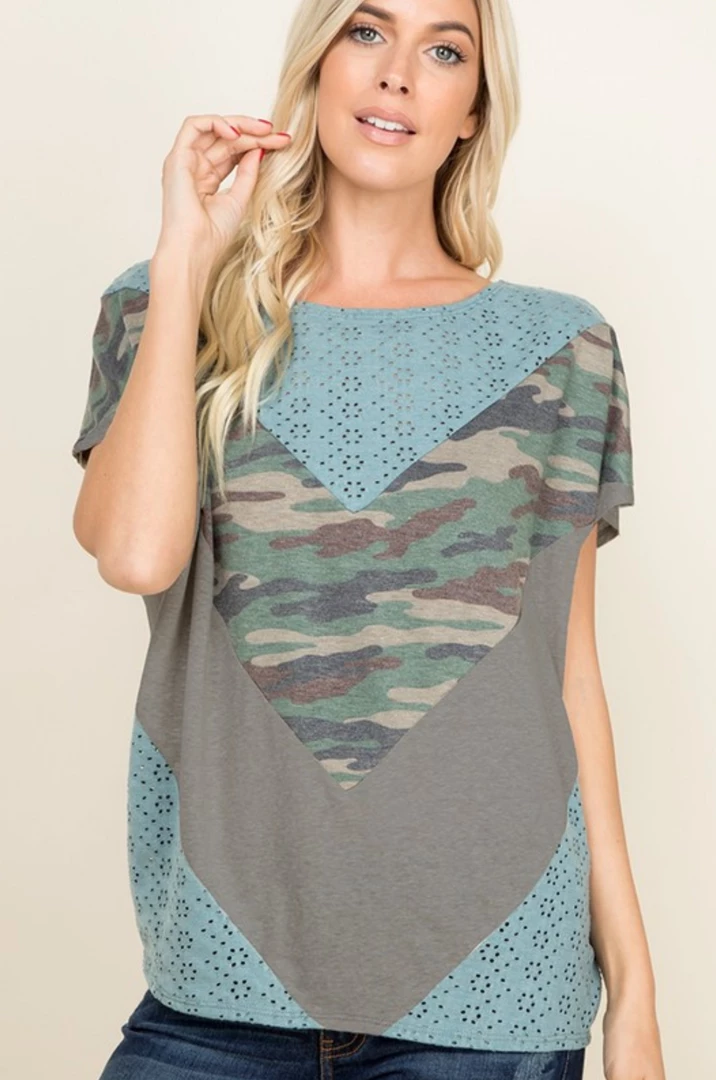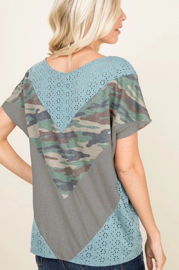 This eyelet top is truly one of a kind. The eyelet details are to die for and the the chevron color block fabrics compliment it so well. Featuring short sleeves, a round neckline and relaxed fit.