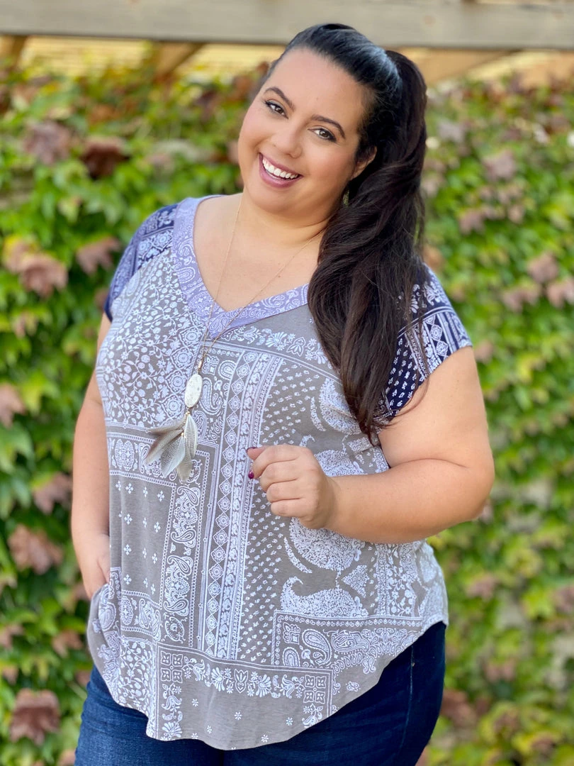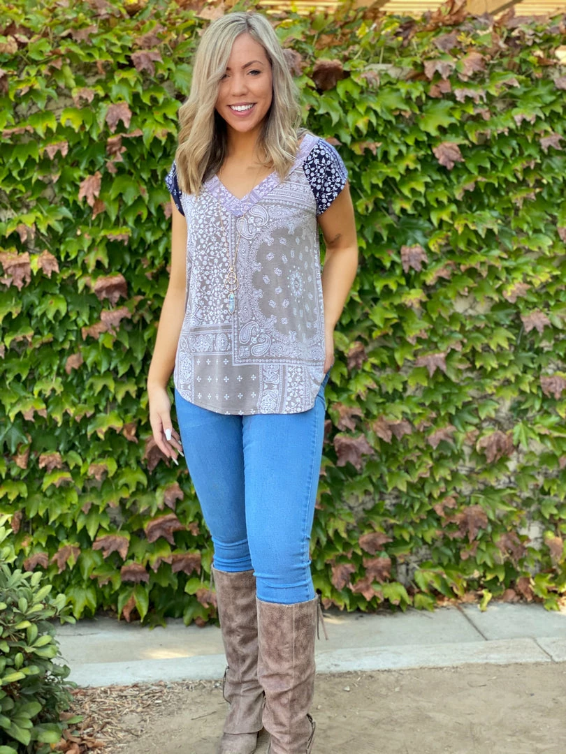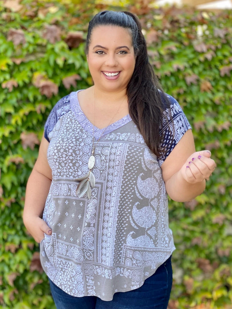 Sweet as Paisley Mae, this short sleeve top is absolutely adorable. Not only will it look great on it’s own, but it will look equally amazing layered under your favorite cardigan or jacket. Featuring an a-line silhouette, v-neck and cap sleeves.