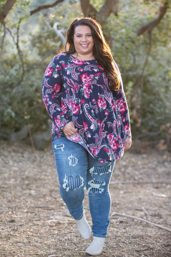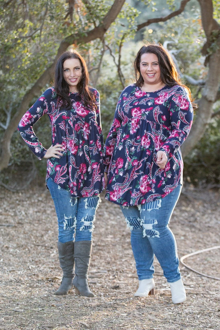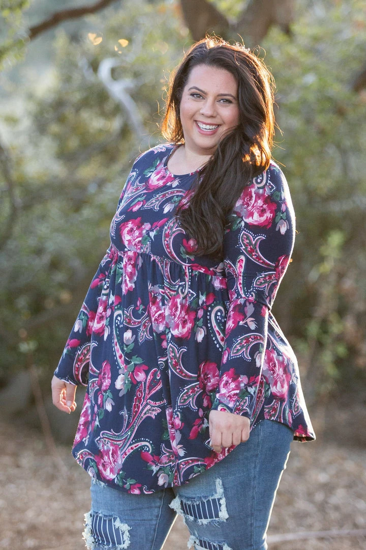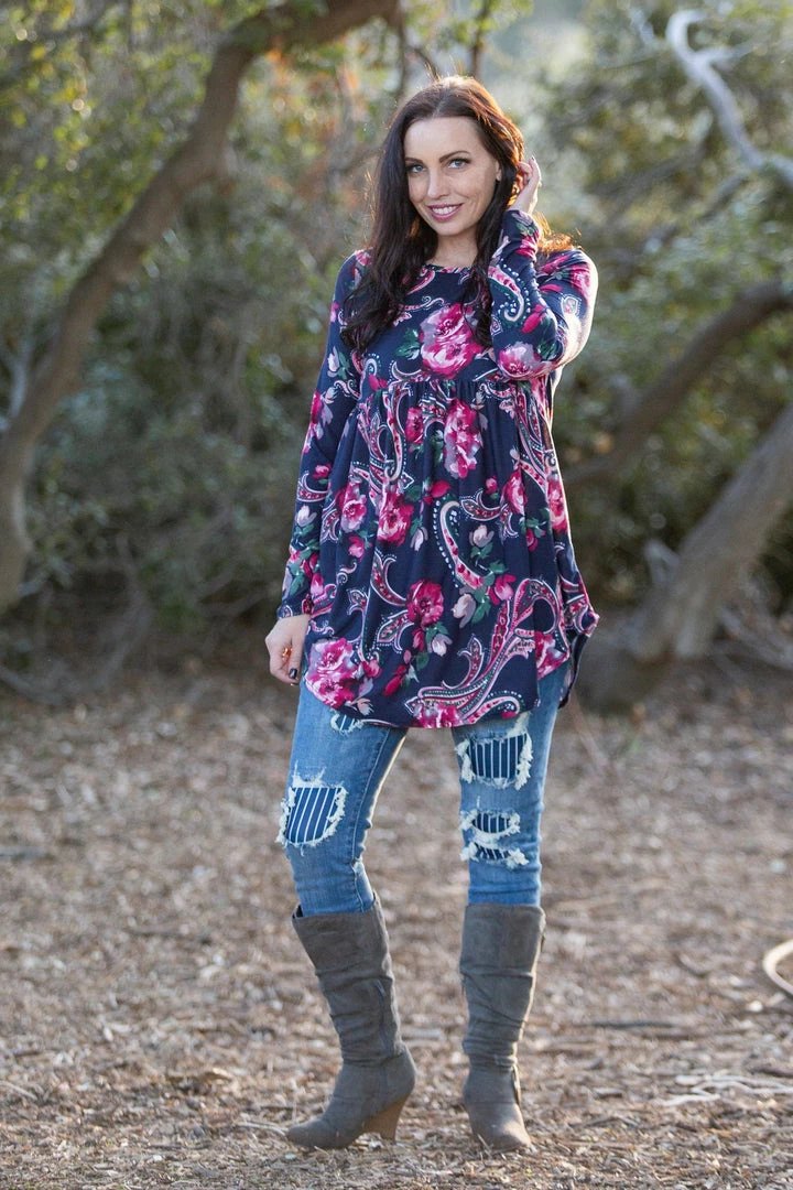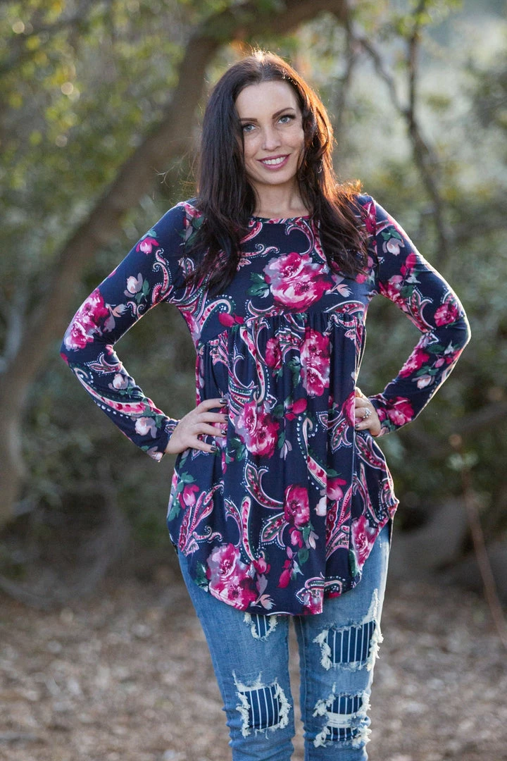 OMG, this long sleeve babydoll top is absolute perfection. The magenta paisley and florals print really pops against the dark navy background. This top has amazing stretch and is made from the most buttery soft baby suede. Featuring a round neckline and rounded, this top will pair well with just about anything.