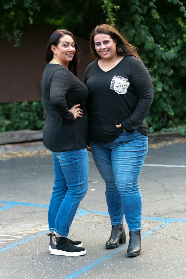 One can never own enough waffle knit tops and the cut of the waffle knit top is absolute perfection. With a relaxed fit this top features long sleeves, v-neck and double front pocket detail.