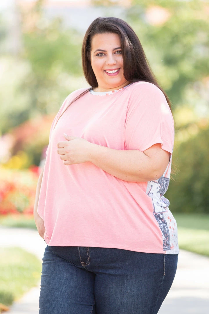 There’s nothing better than the fit of a dolman tee, and we are swooning over the patchwork back panel on this one. With a relaxed fit, this top features a pleated patchwork back panel, round neckline with patchwork trim and short dolman sleeves.