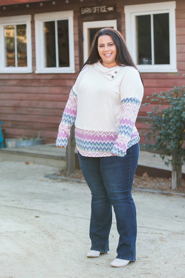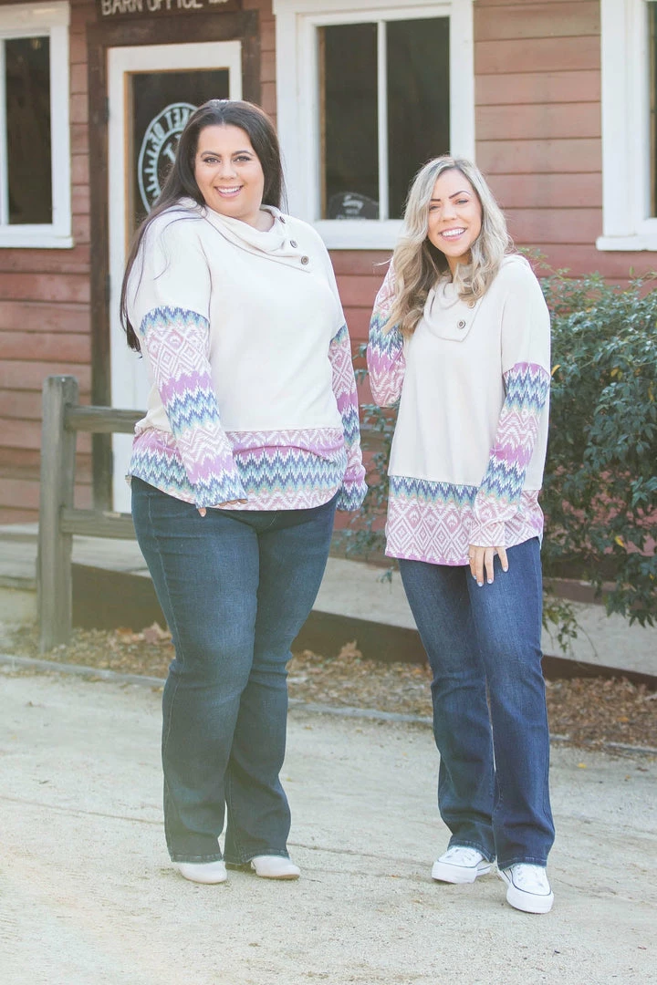 This gorgeous cowl neck has the most harmonious colors throughout. Made from the softest brushed fabric; which has a cashmere feel, this top features long sleeves, cowl neck with a button detail and a relaxed fit.