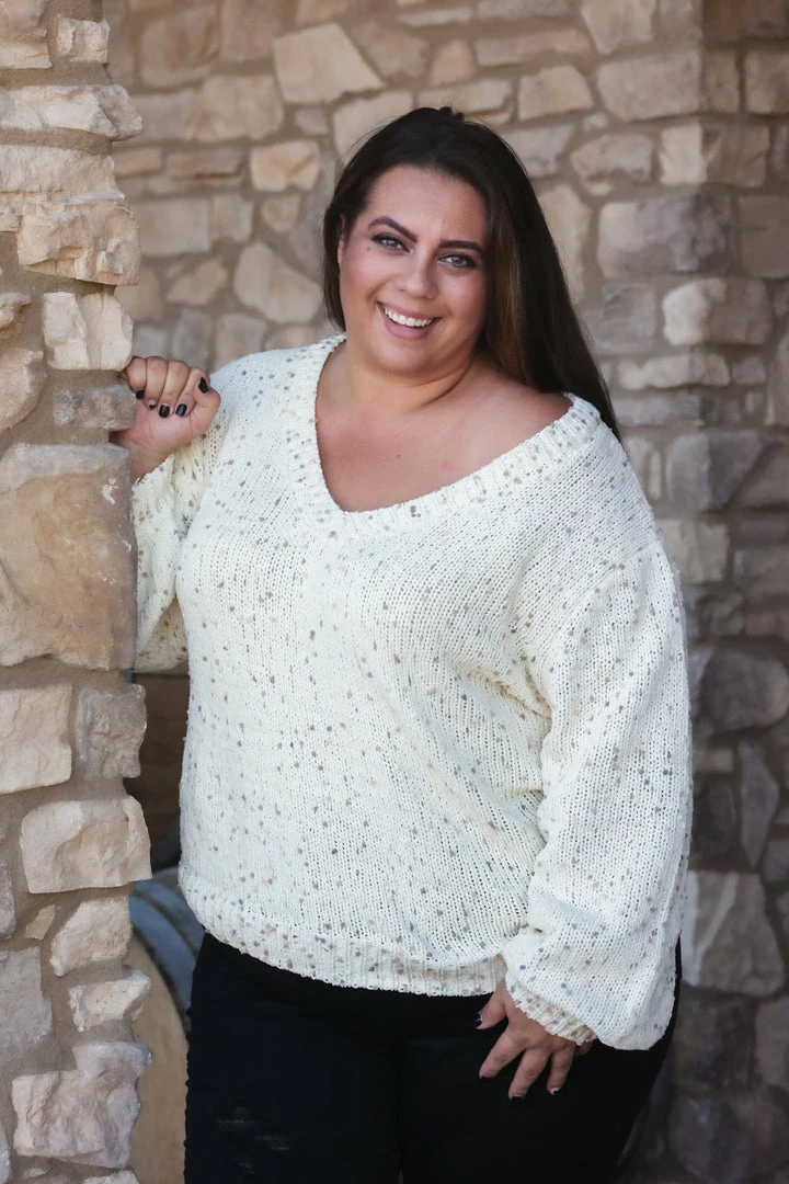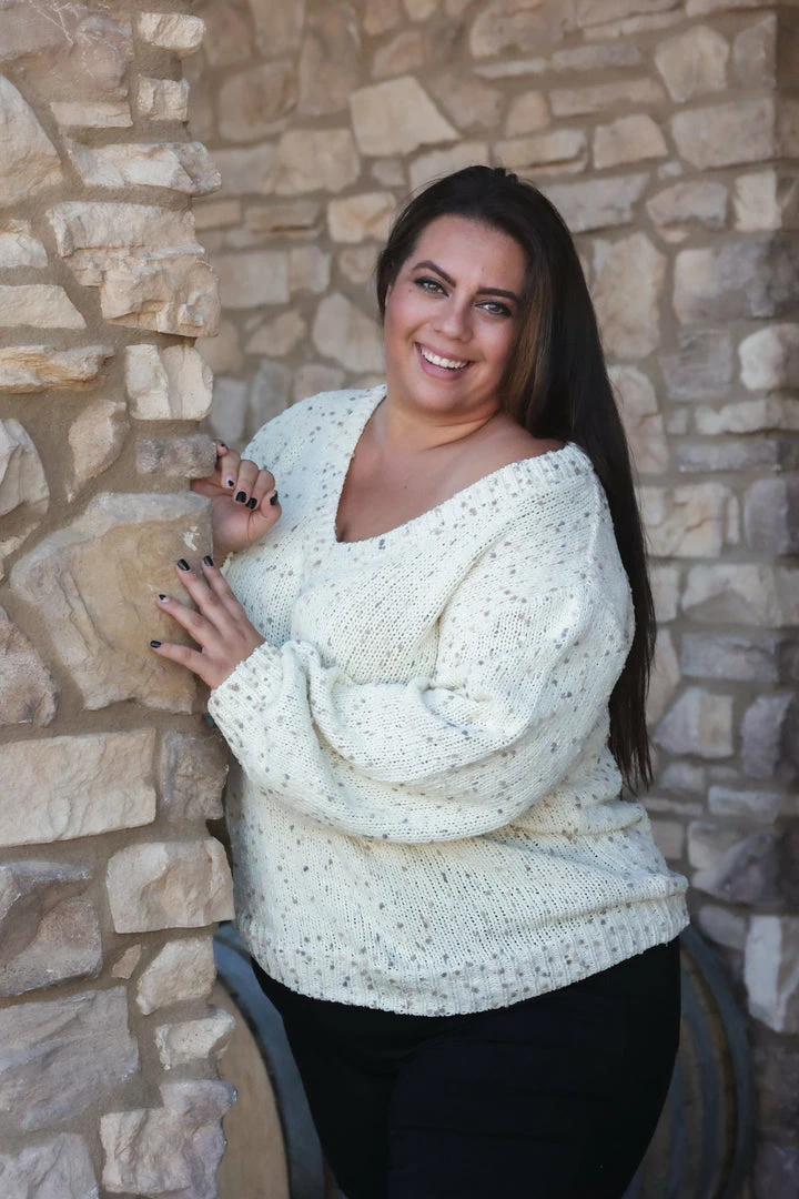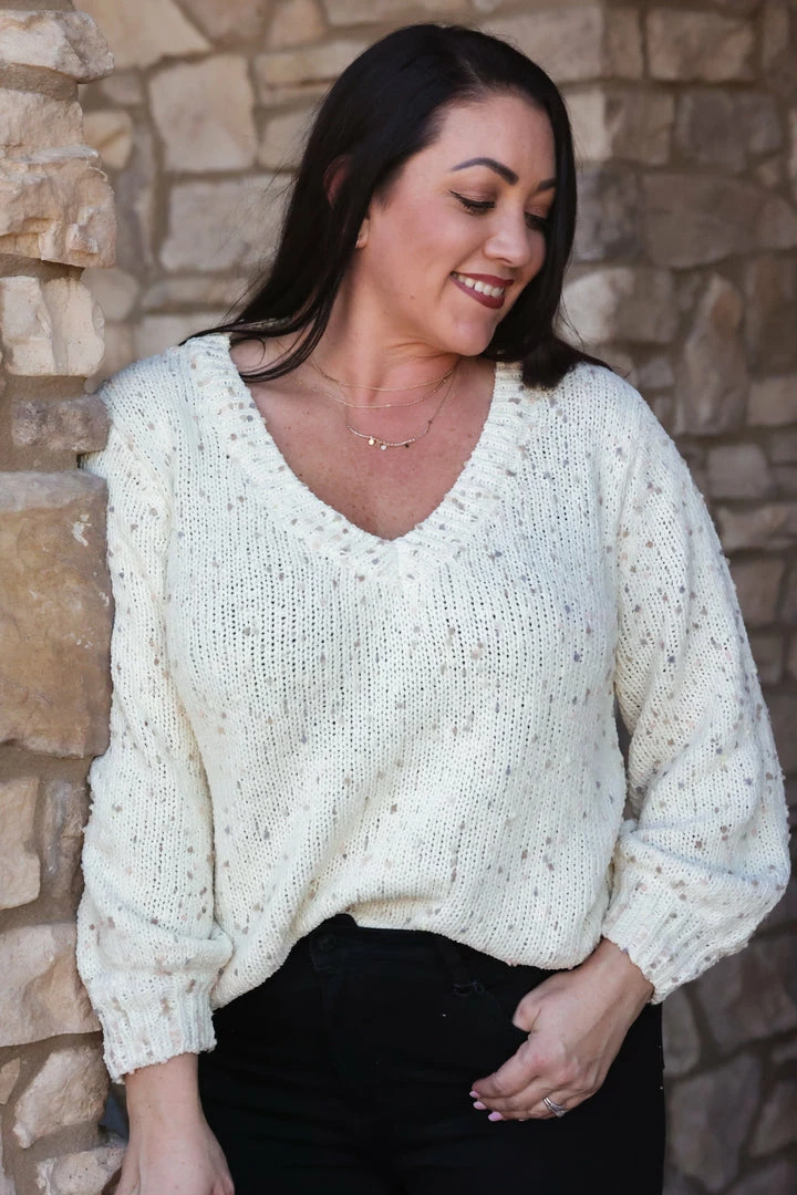 They neutral color combos in this, oh so soft, knit sweater is perfectly spiced with orange undertones. With a relaxed fit and v-neck, this will become one of your go-tos this season.