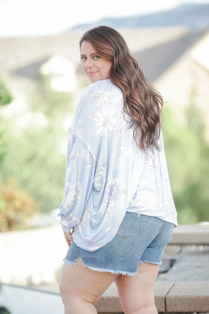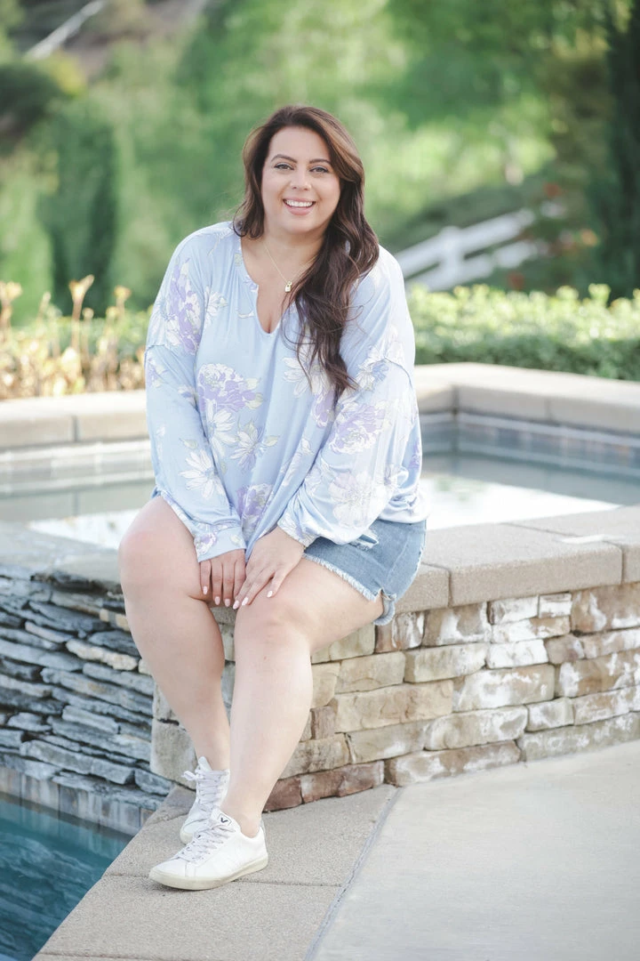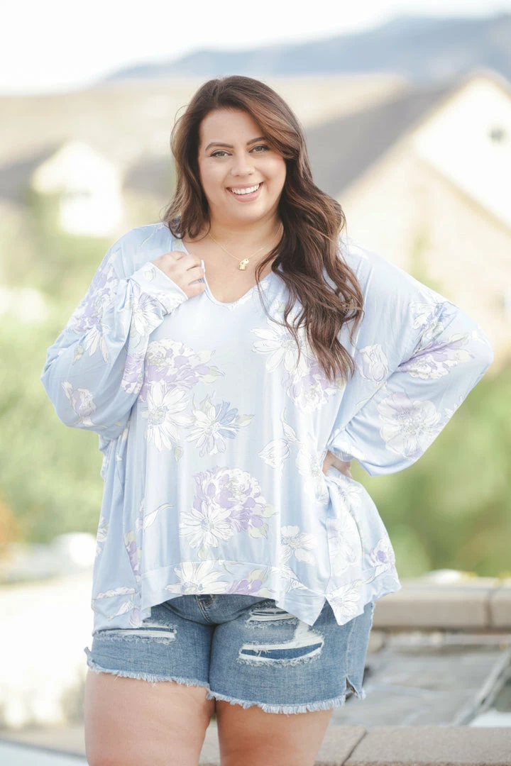 THE perfect Spring blue! This oversized long sleeve top is the perfect top to transition into spring with. Made from the softest jersey material, this top features long balloon sleeves, and open v-neck and hi lo hem.