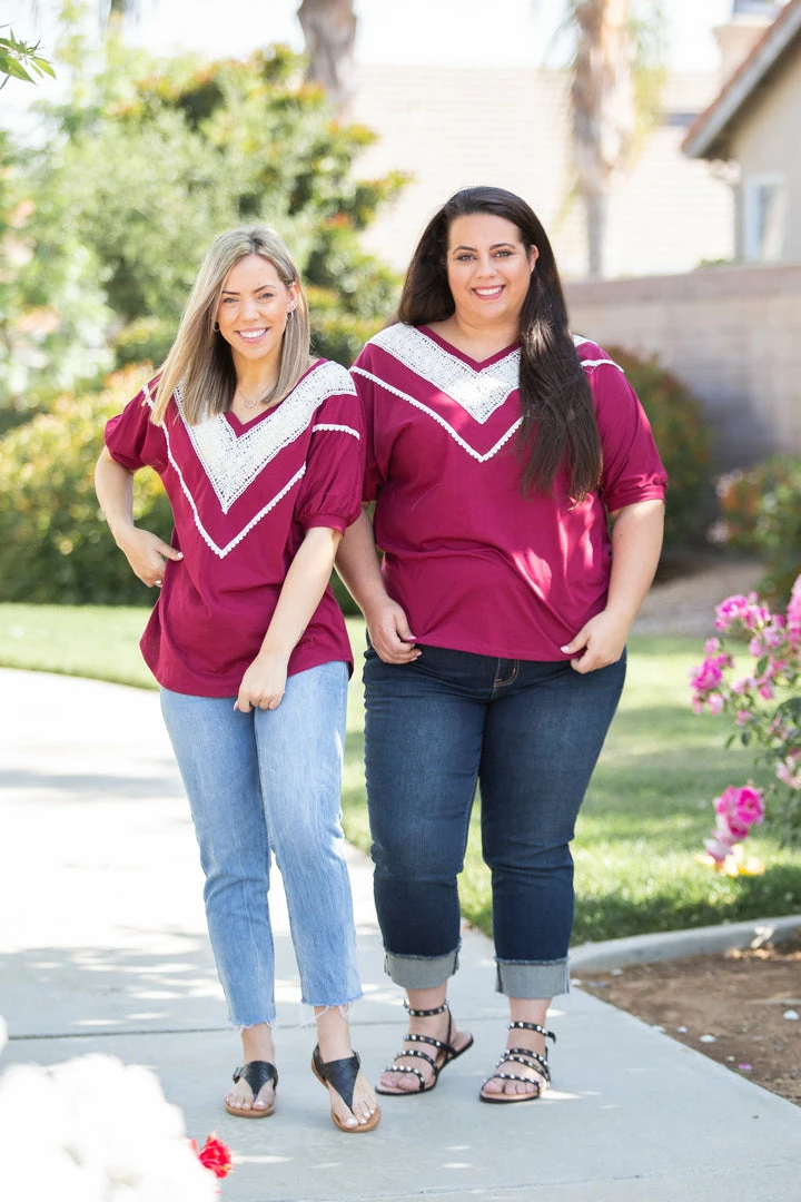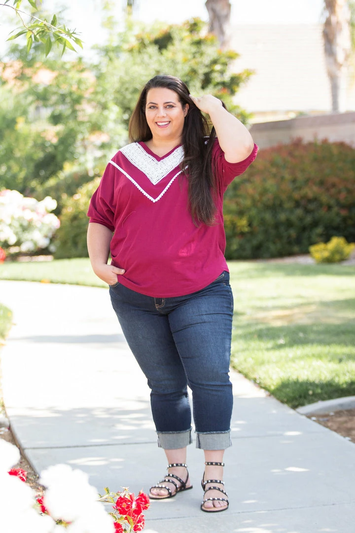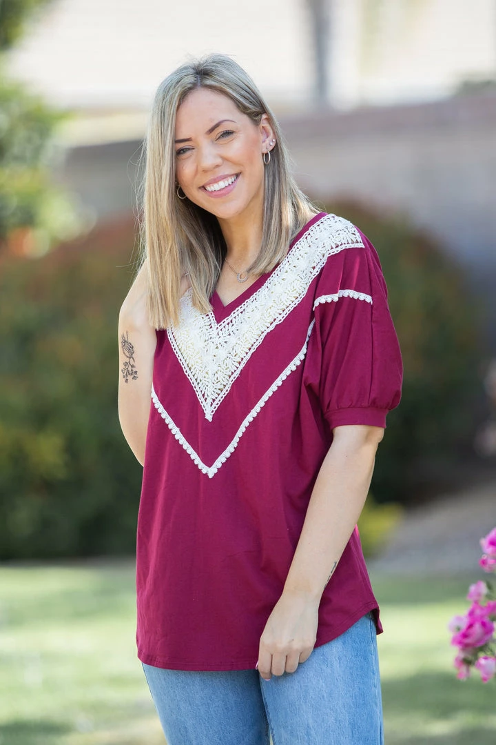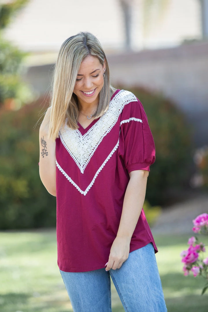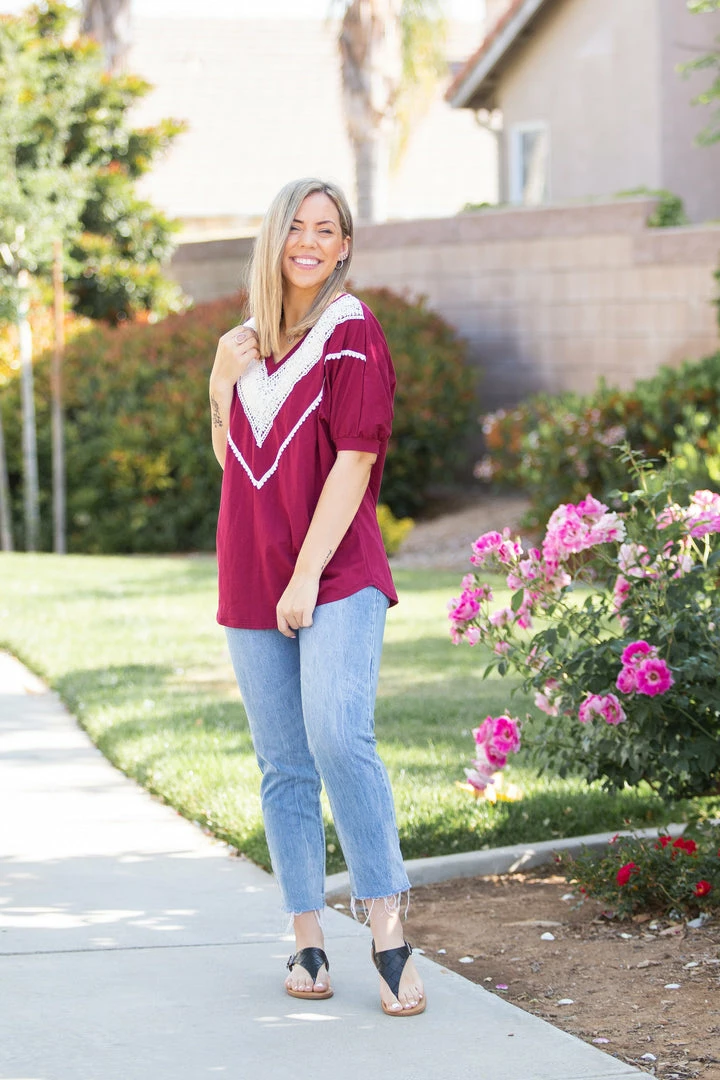 We are loving this vintage burgundy short sleeve top, the color reminds us of relaxing on a summer day with a nice glass of Pinot Noir. With a relaxed fit, this top feature short cuffed dolman sleeves and gorgeous lace trim around the v-neck.