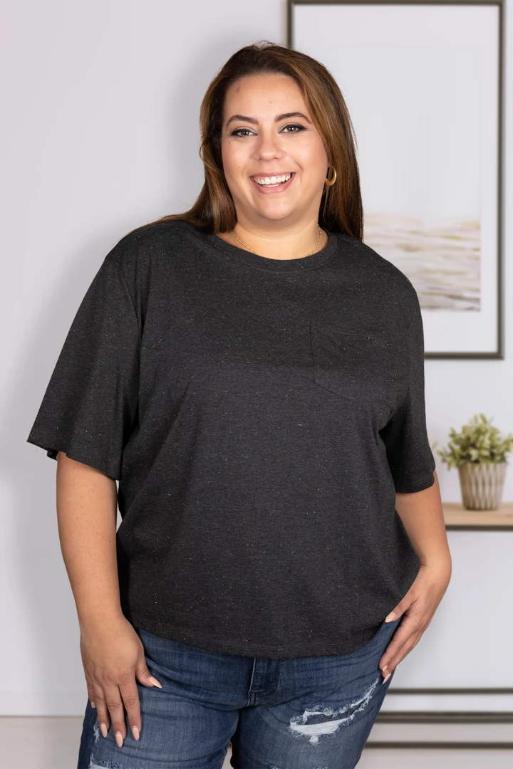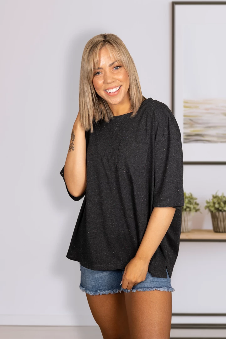 This black short sleeve top looks like it was sprinkled with pixie dust with all the neon specks of fabric throughout. With a relaxed fit, this top features a round neckline, short sleeves and front pocket detail.