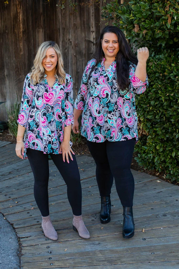 Searching for the perfect lightweight tunic? Look no further. The gorgeous paisley printed Gabby is extraordinary, as the paisley lines are raised! Think puffy paint!!! Squeel!! Featuring a banded collar, v-neck and buttoned 3/4 sleeves, this top will make getting dressed seem effortless.