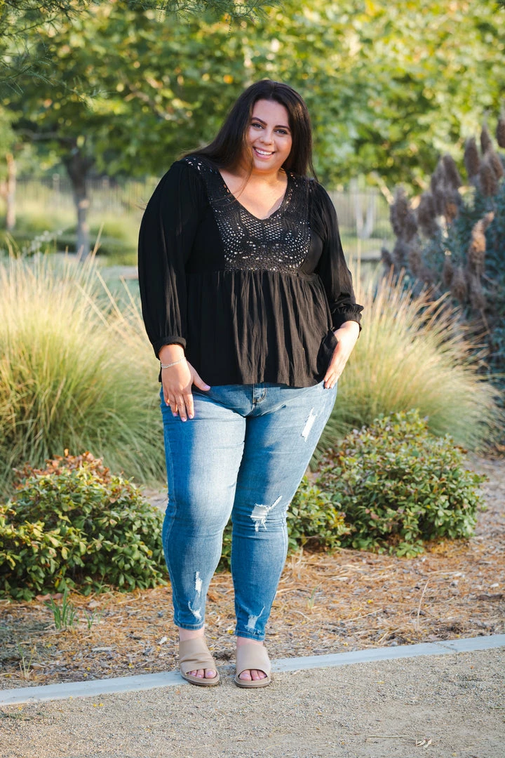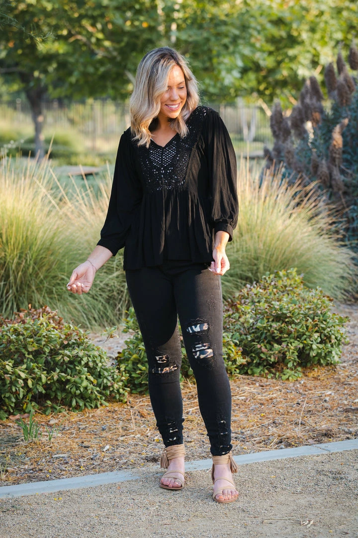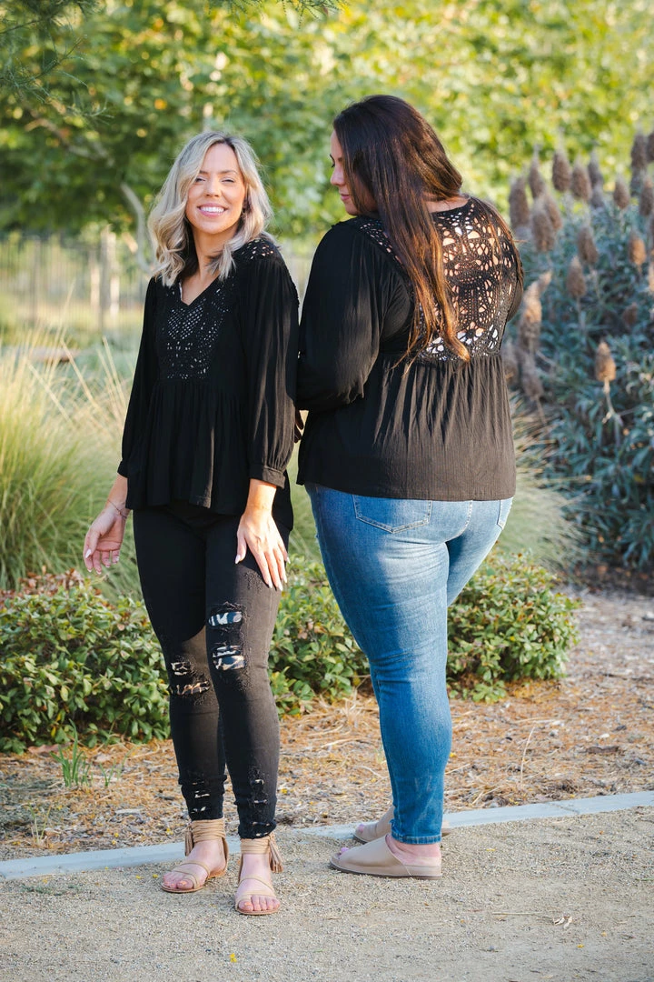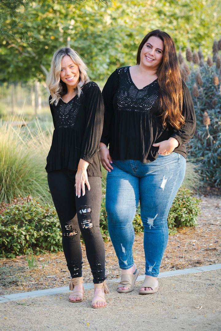 This 3/4 sleeve top is pure decadence with the crochet detailing throughout. With a relaxed fit, this top features a v-neck with front and back crochet details (the front does have an fabric insert so it is not see-through), 3/4 banded sleeves and empire waist.