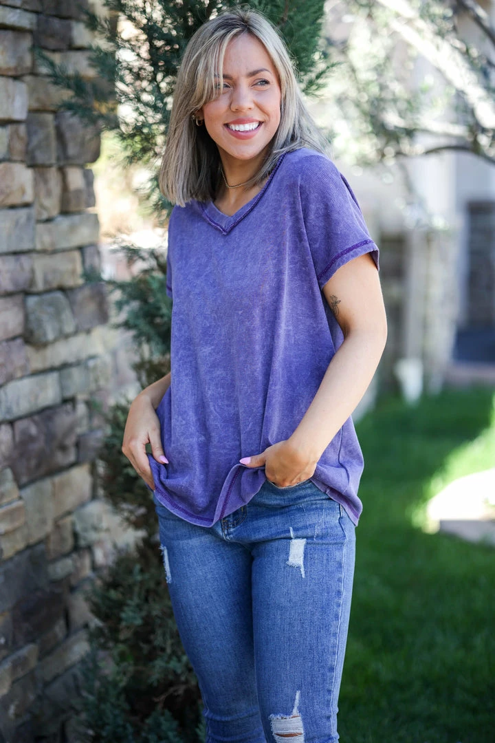 This short sleeve mineral washed top is made from the highest quality mini ribbed material you can imagine. With a relaxed fit, this top features a v-neck with exposed hem detail and short dolman sleeves.