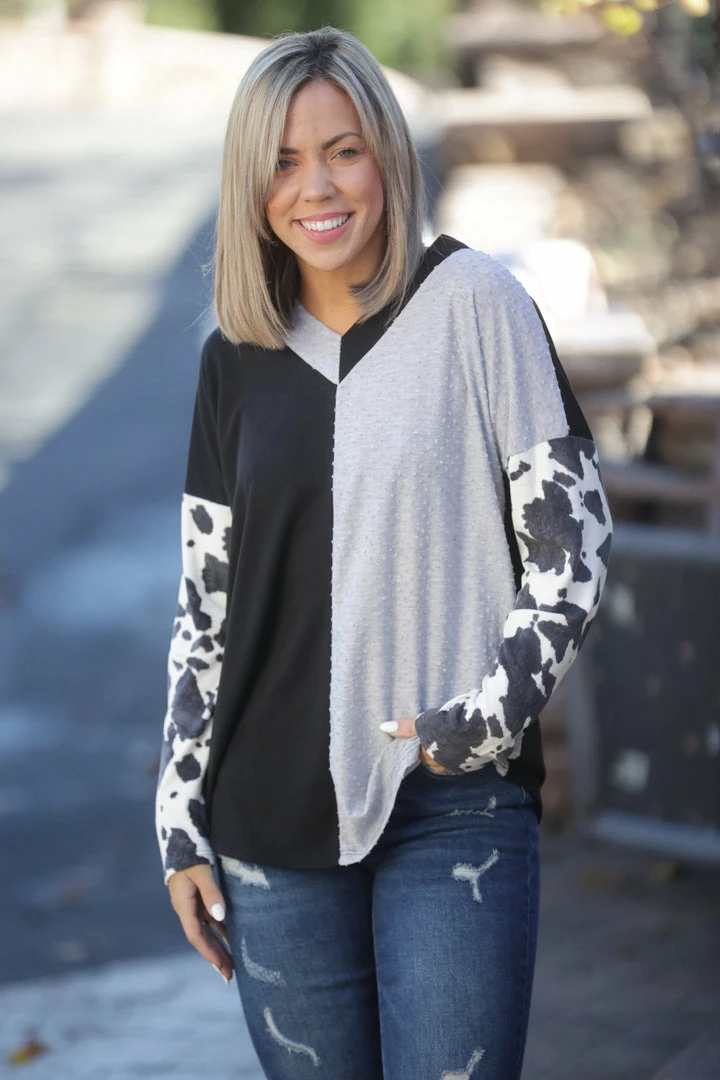 We are “udderly” in love with this amazing colorblock top! Not only is it made with THE softest fabric, but it’s also ultra comfortable. With an oversized fit, this top features a v-neck, long sleeves and banded hem.