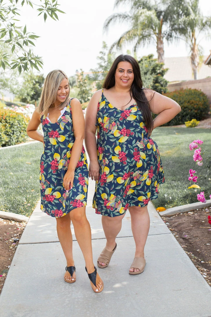 Like fresh squeezed lemons, this dress is as fresh as it gets. Seriously the perfect summer print with the lemons, berries and birds. With a relaxed fit, this dress has a self close tie in the back so you can really make it fit your body best. This dress is lined to perfection so there is nothing sheer about it, and it also has pockets!