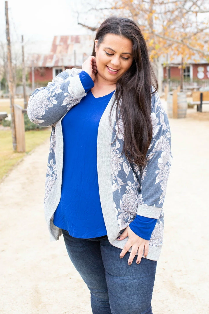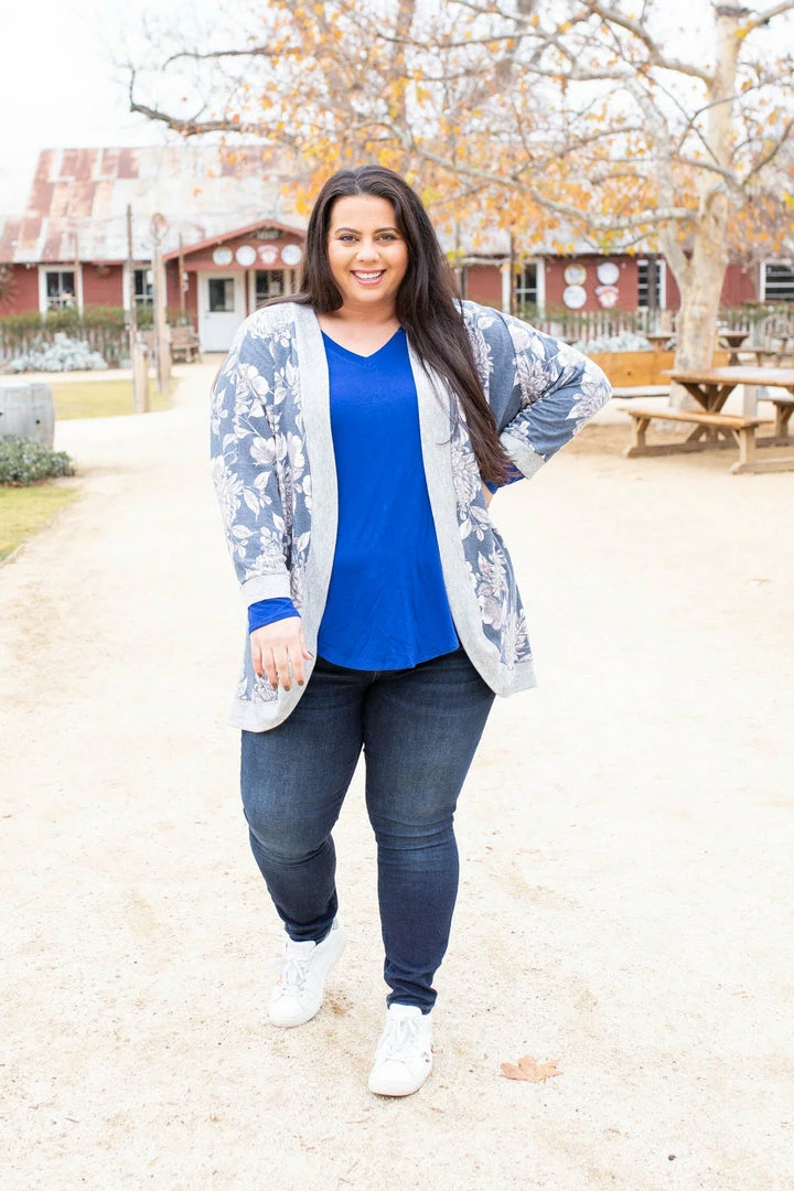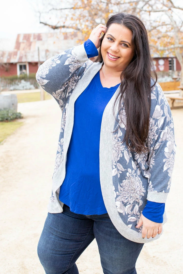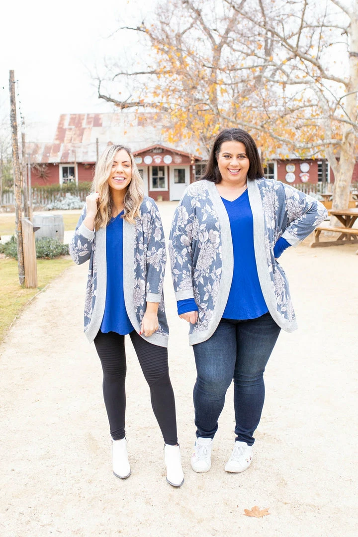 This amazingly cozy floral knit cardigan is the perfect addition to your wardrobe. Featuring an open banded front, 3/4 dolman sleeves with banded cuffs, this cardigan will seriously become your next go to layering piece.