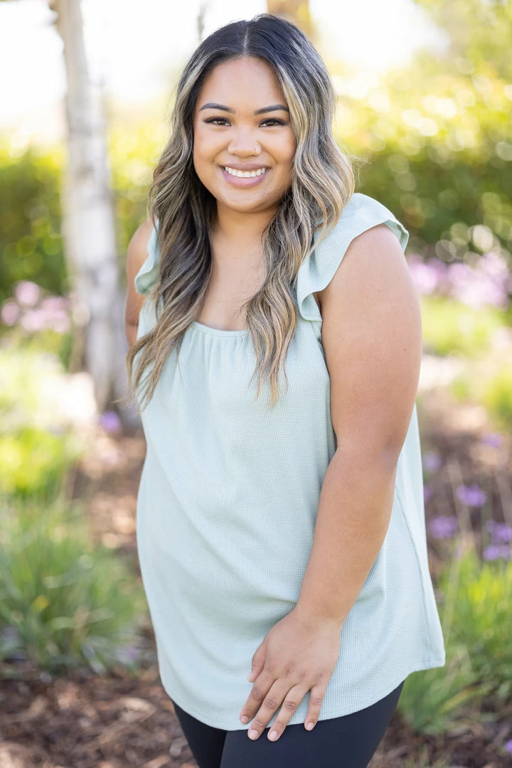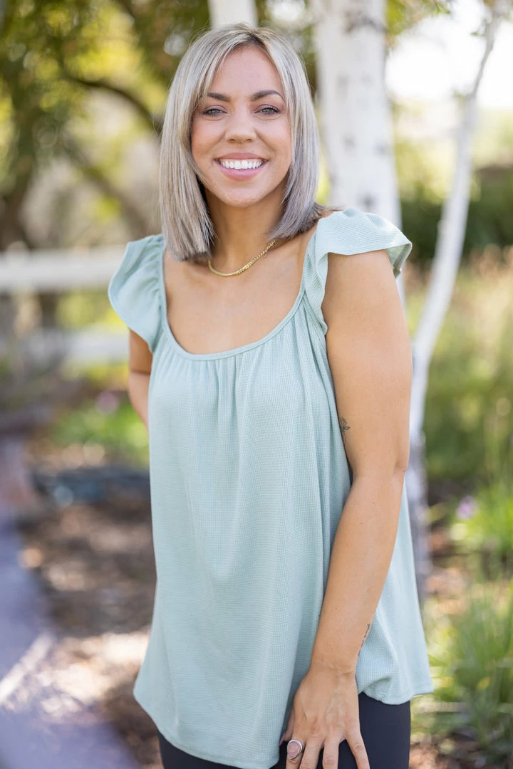 The perfect shade of Sage, paired with the perfect thermal knit makes this flutter sleeve top the perfect addition to your wardrobe. With a relaxed fit, this top features a scoop neckline, short flutter sleeves and rounded hem.