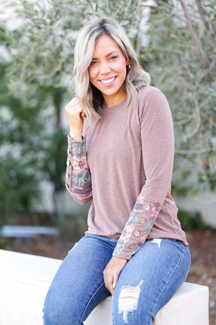 This two tone mocha long sleeve top has the most amazing tie dye cuffs with button details. With a semi relaxed fit, this top features a round neckline, long sleeves and rounded hem.
