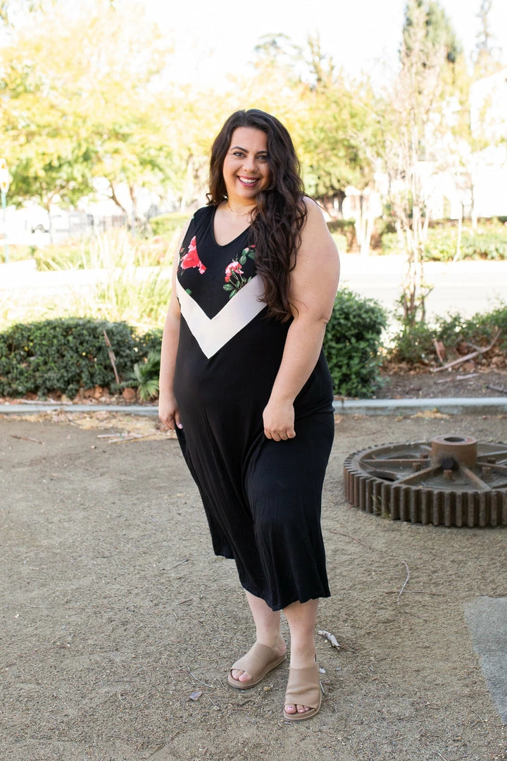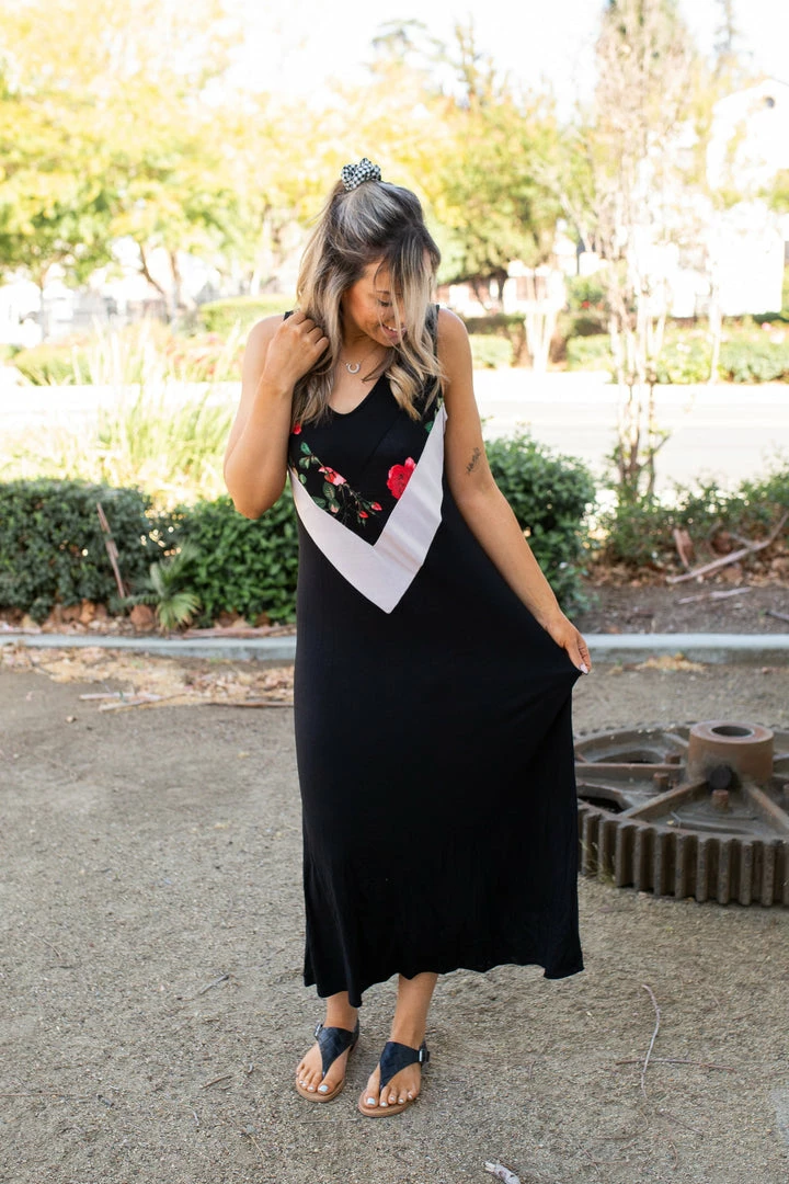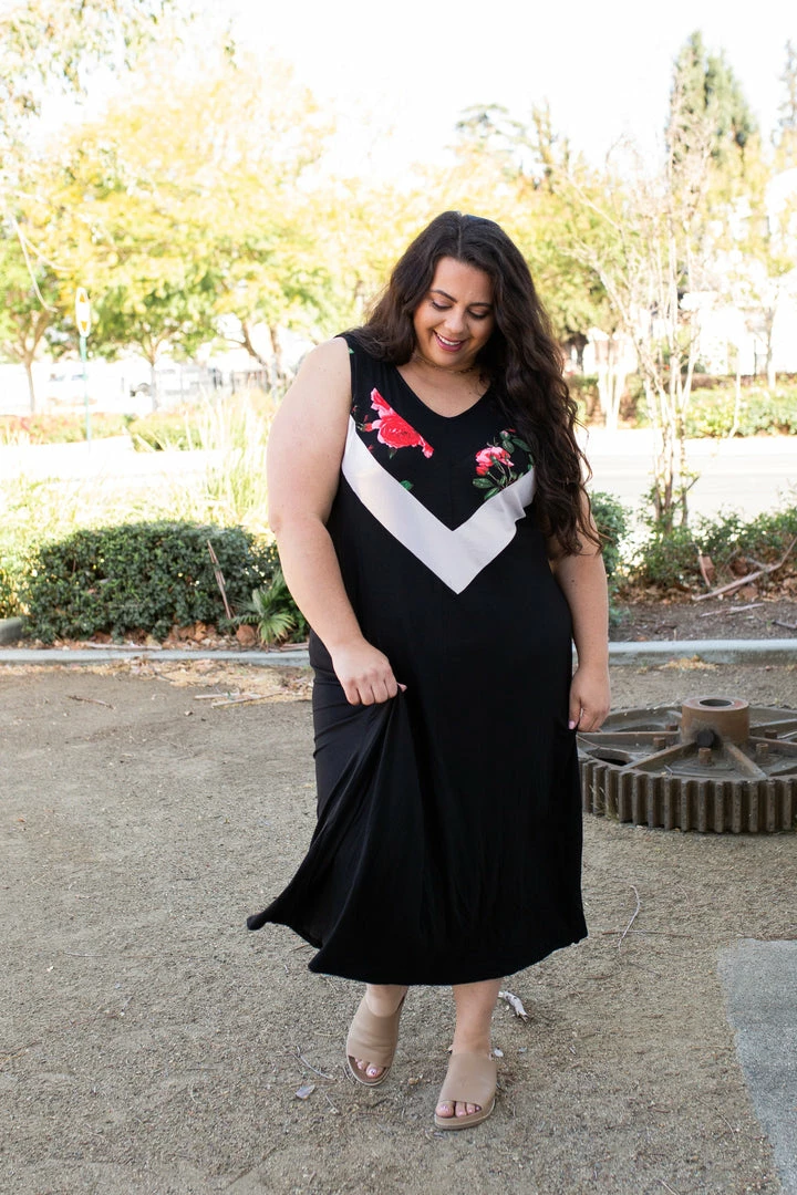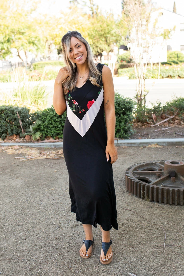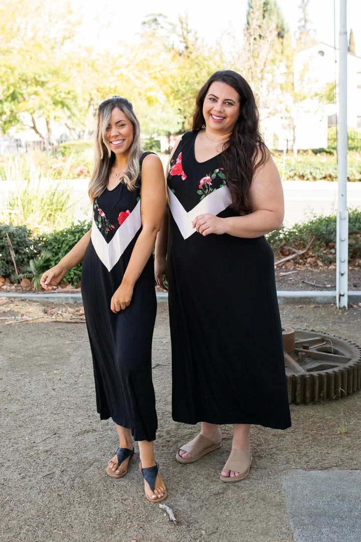 Shine like the beautiful rose you are while wearing this amazing sleeveless maxi dress. Made from a soft jersey fabric, this dress features no fuss straps, a v-neck and floral and shimmery colorblocking.