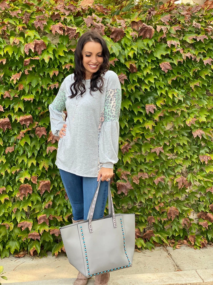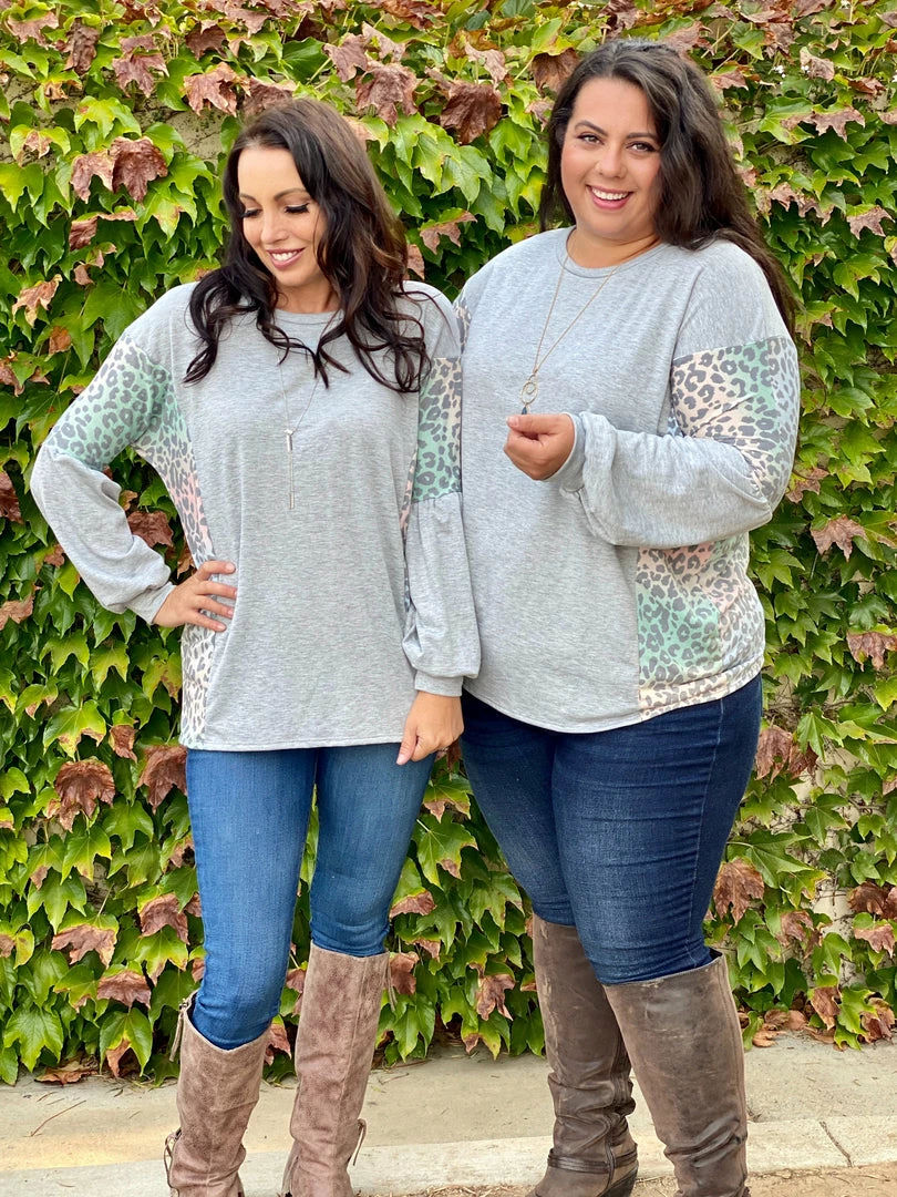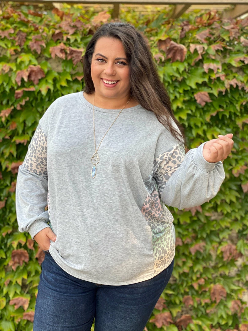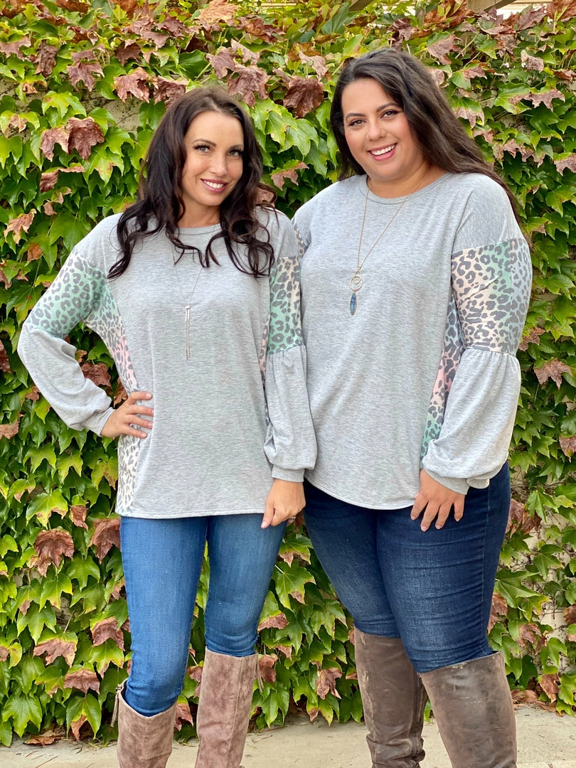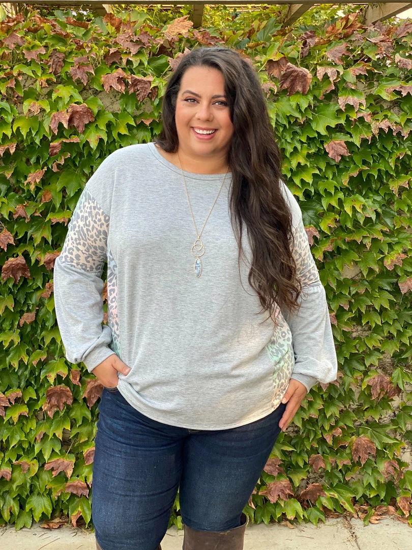 Every grey cloud has a silver lining and this long sleeve top brings so much joy to us with the rainbow printed contrasting animal print on this solid grey base. Featuring a scoop round neck, balloon sleeves and relaxed fit.