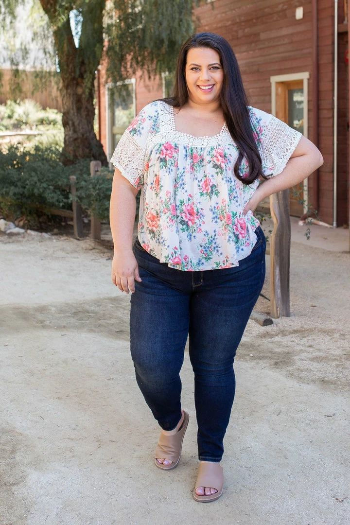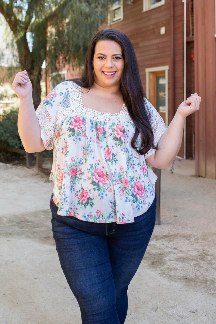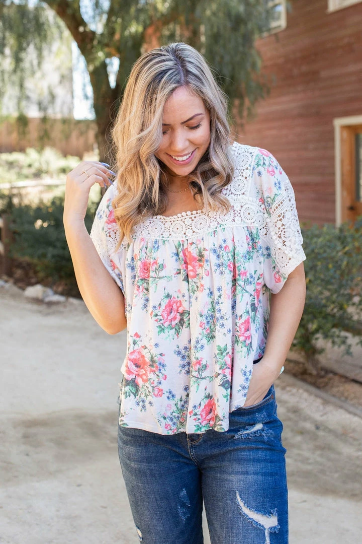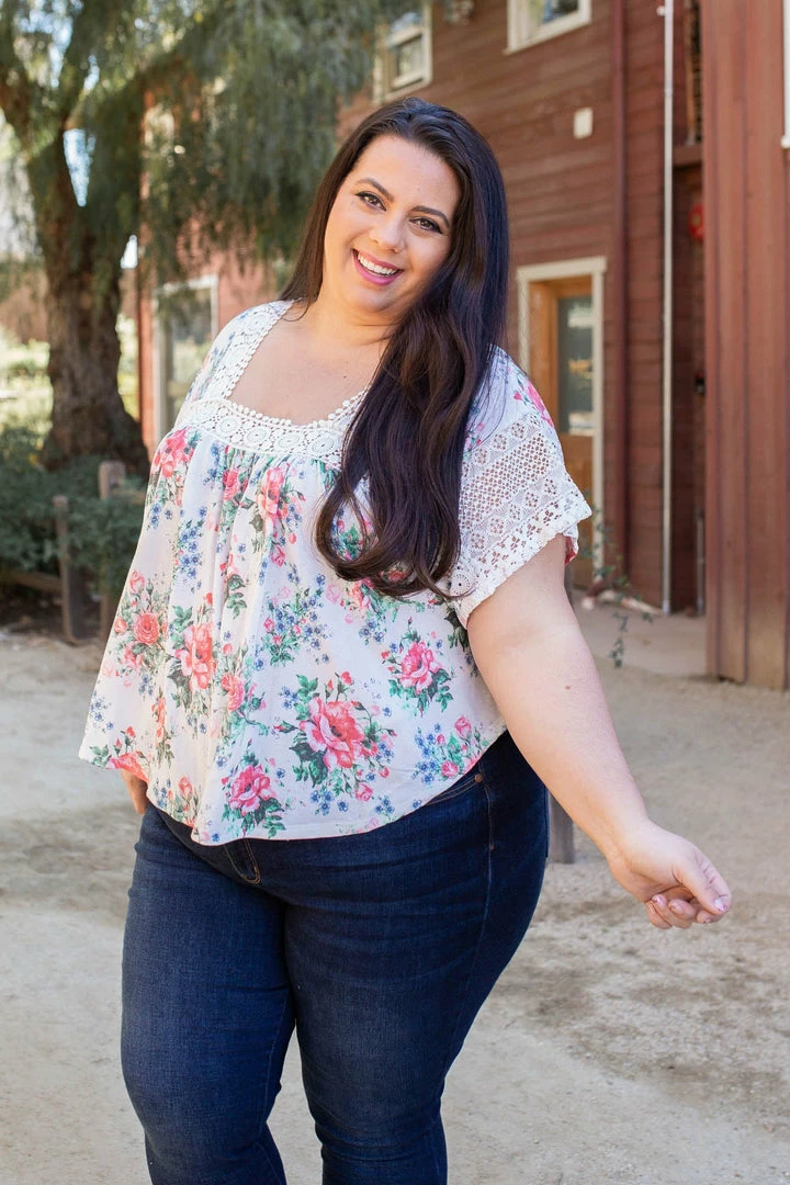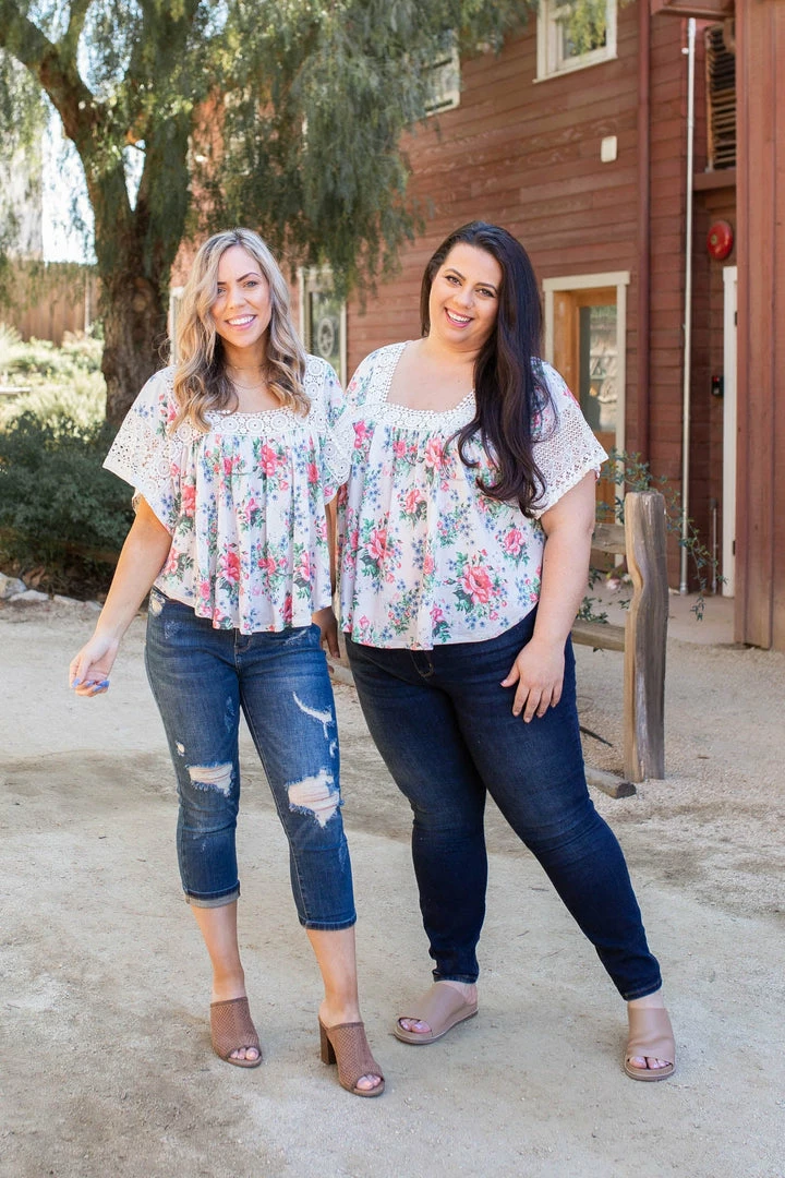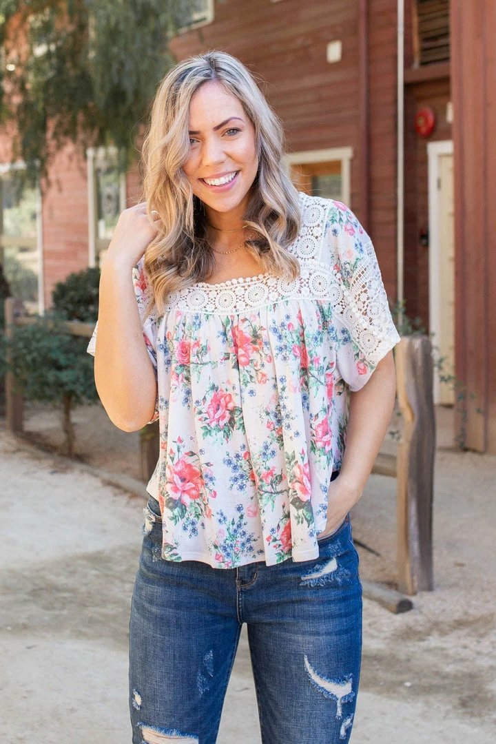 This lace trim top is simply gorgeous. With a relaxed boxy fit, this top features short laced bell sleeves, a square neckline with lace trim detail and a shirttail hemline.