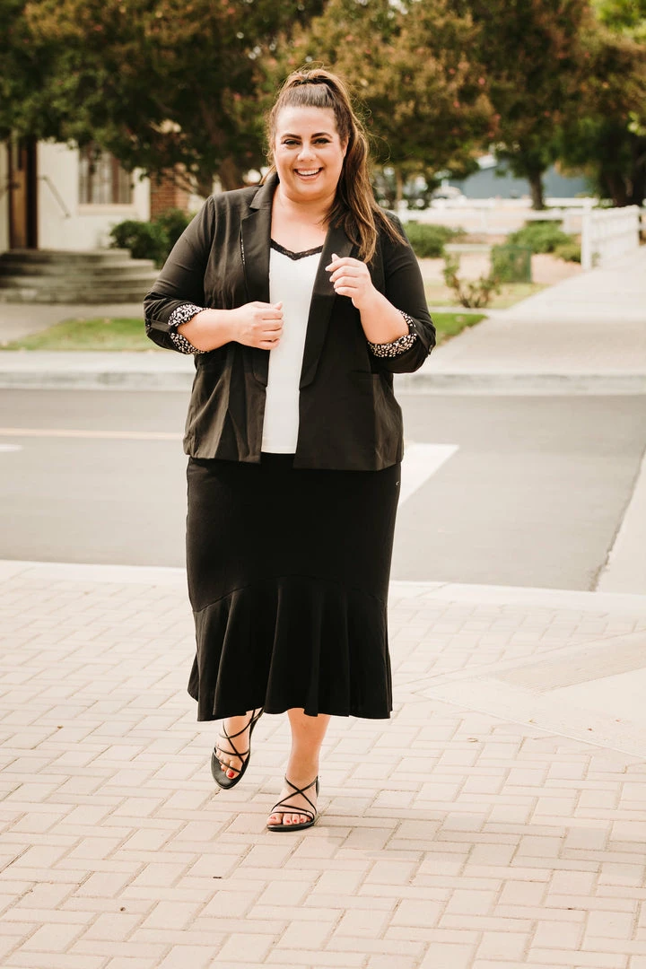 - Callie is 5’8 wearing size 3X (Paired with Classy Lace Trim Tank and Business Pizzaz Blazer)