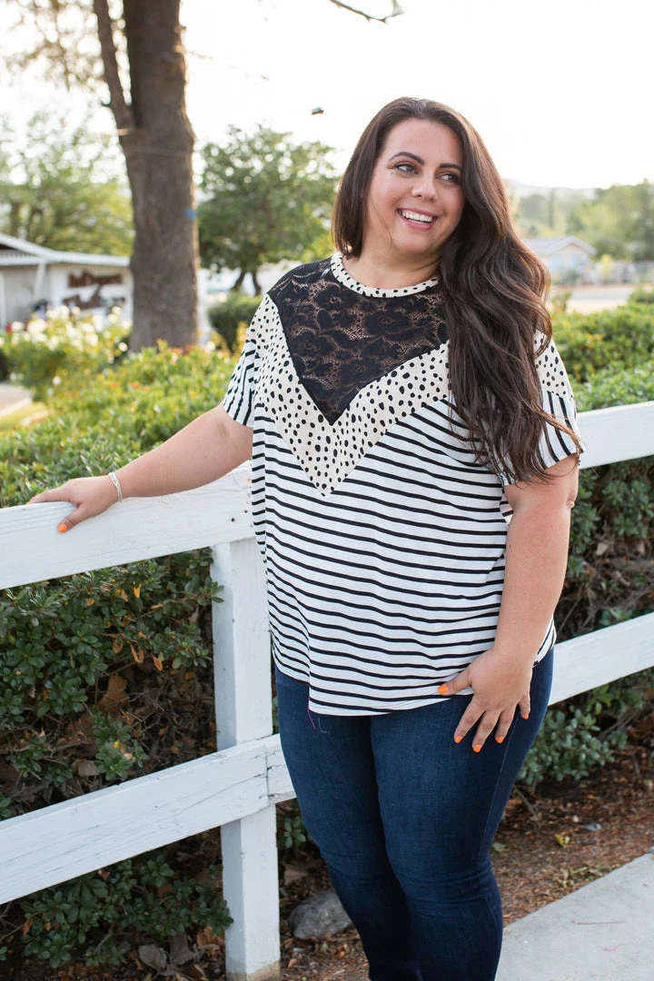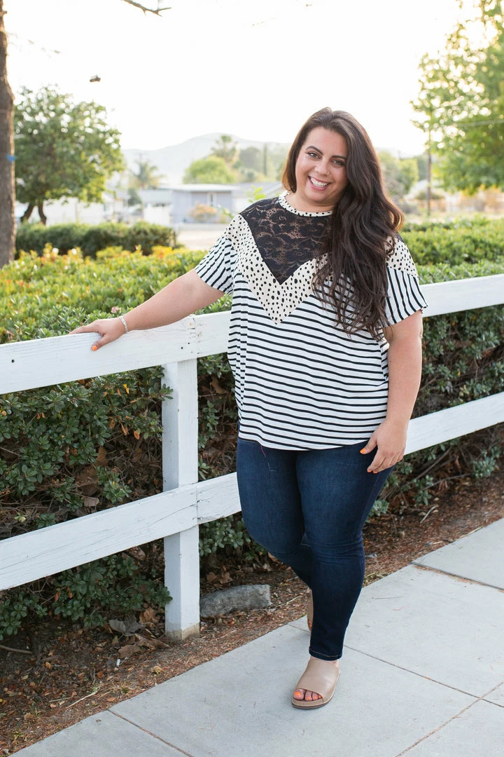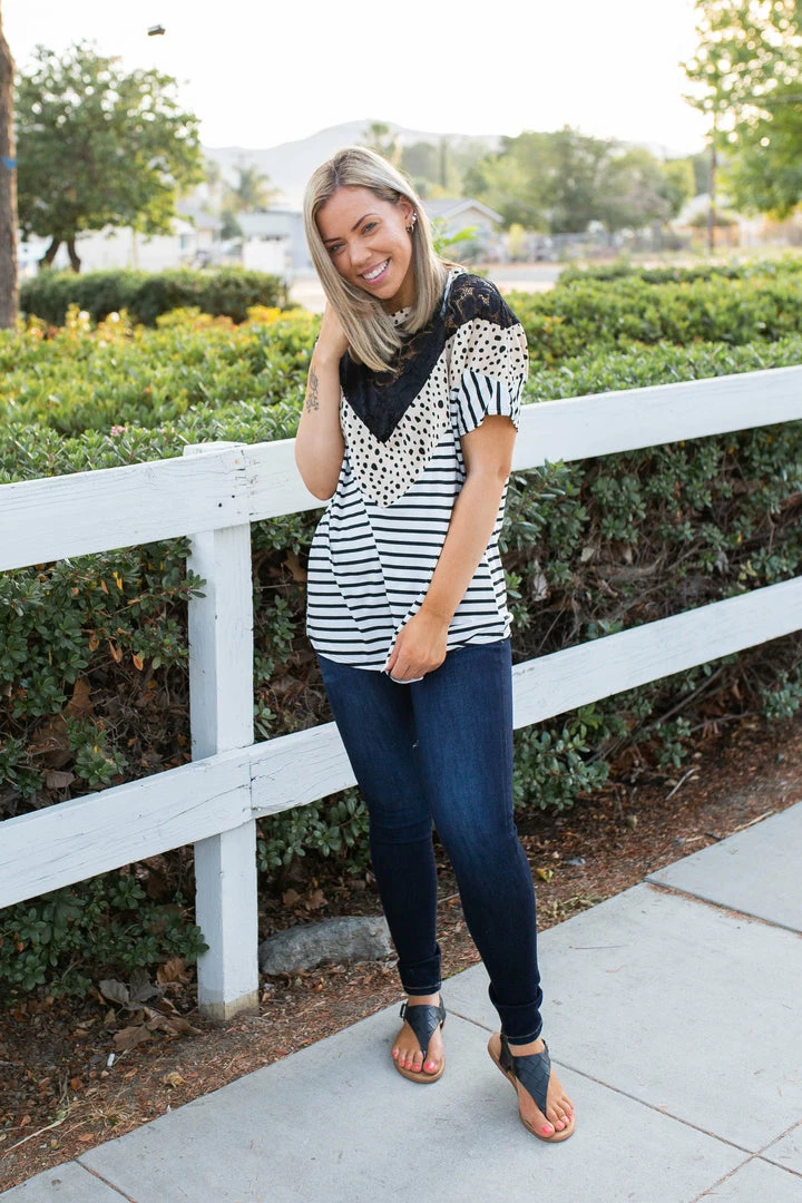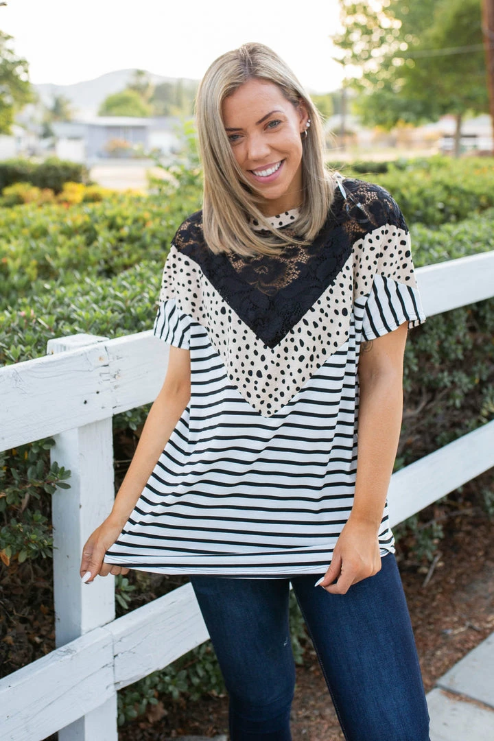 There are so many reasons why we are in love with this top, and we know you will love it just as much. With a relaxed fit, this top features a unique chevron colorblock with lace, short dolman sleeves and a rounded hem.