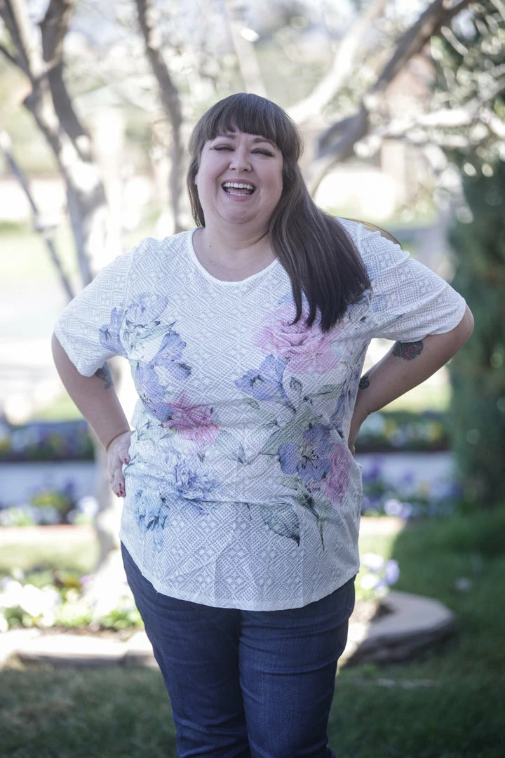 Can’t you just imagine sitting in a blooming garden listening to the sound of silence with this stunning short sleeve tunic. Made from the most amazing textured fabric, this top features a round neckline, short sleeves and rounded hi-lo hem.