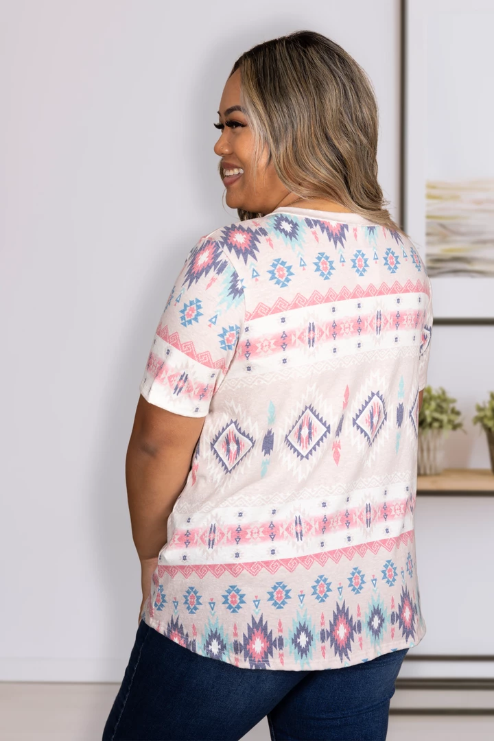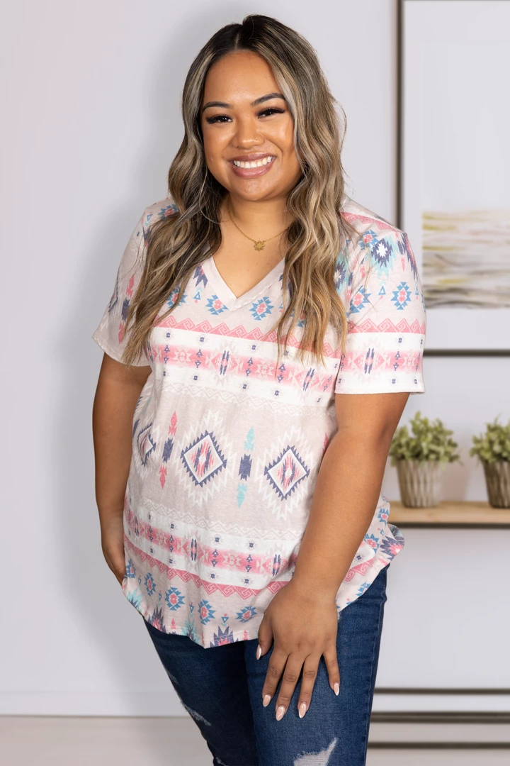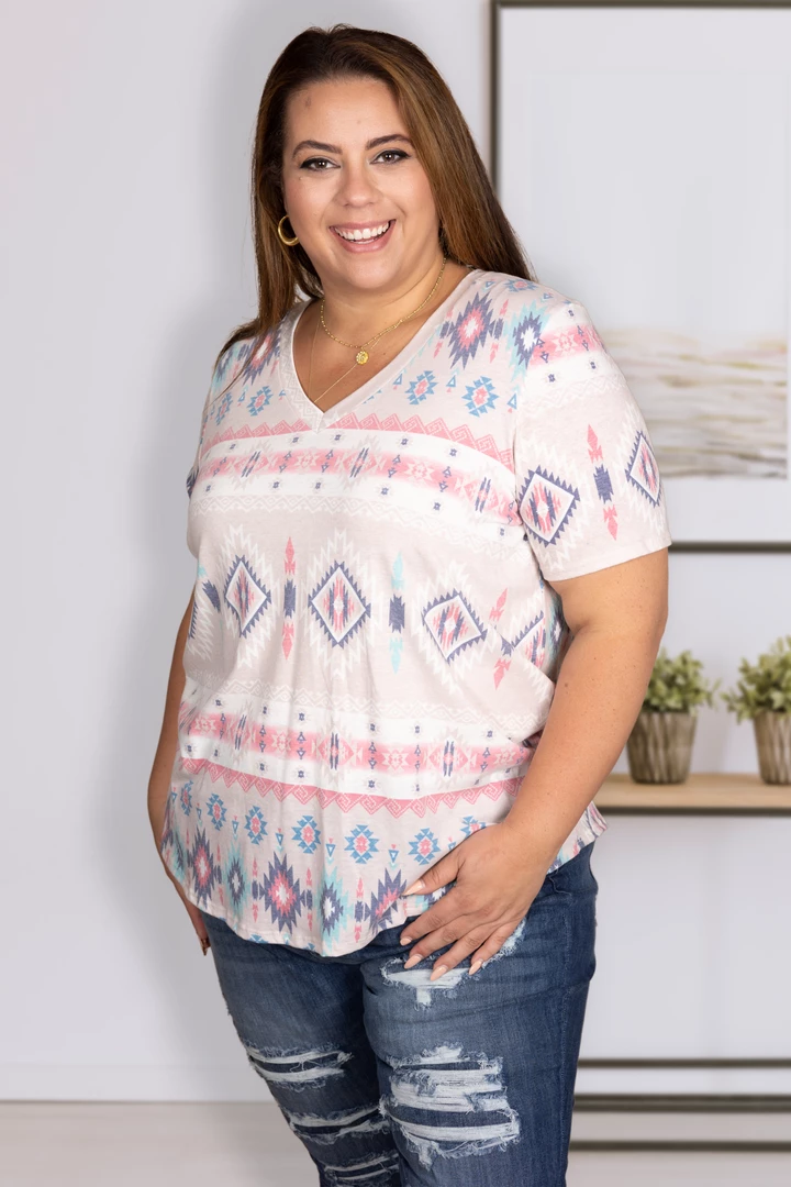 Bring home a little charm of the southwest with this gorgeous short sleeve top. With a relaxed fit, this top features a v-neck, short sleeves and rounded hem.