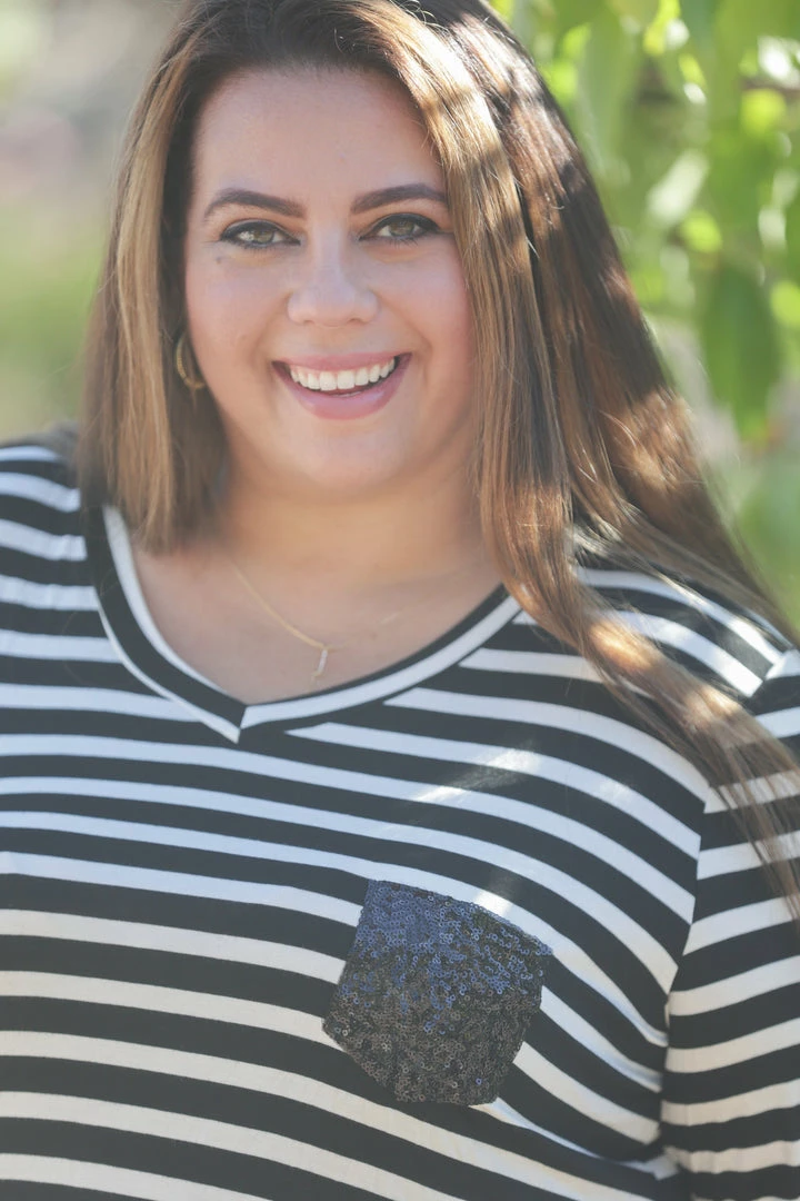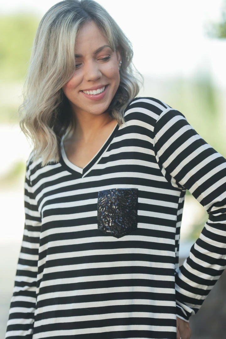 Sparkle the night away in this classic black and white striped top, with sequin pocket. The fit is absolute perfection with a relaxed fit, v-neck, rounded hem and long sleeves and the that front pocket detail really puts this top above the rest.