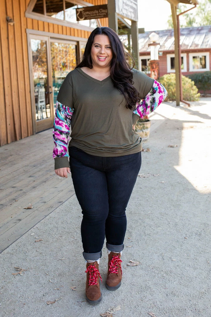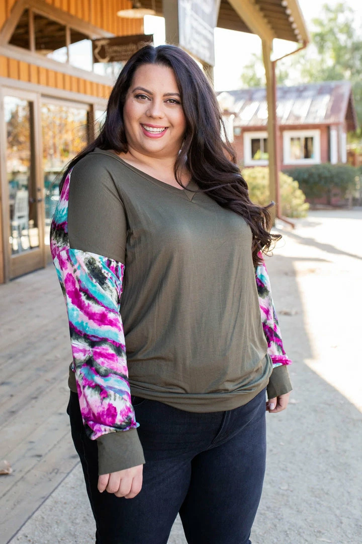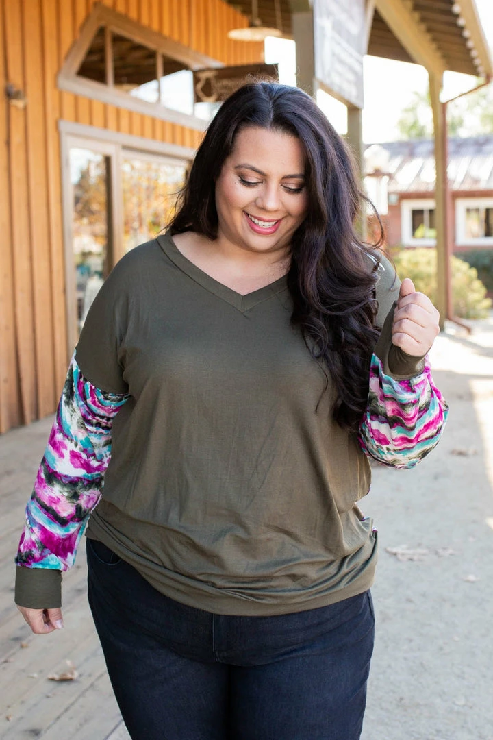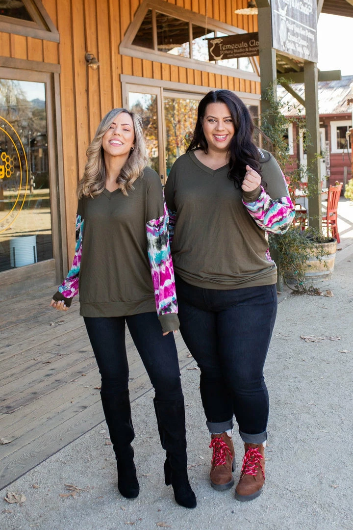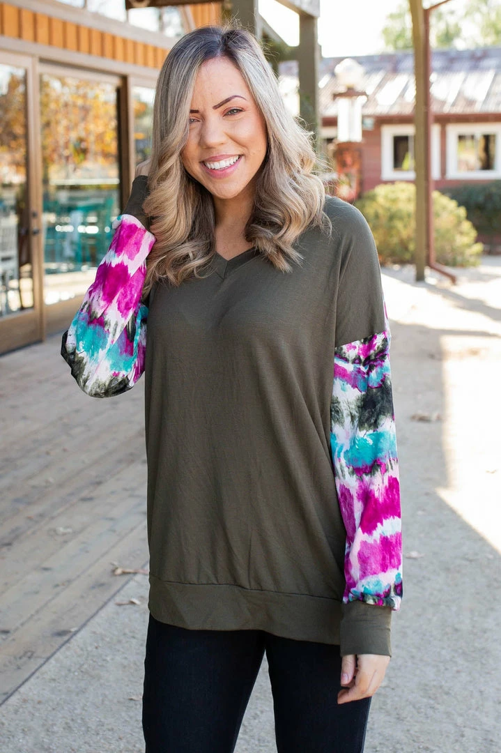 This long sleeve top is sure to awaken your soul with the perfect olive coloring and contrasting tie dye. Featuring a relaxed fit with banded hem, v-neck and tie dyed sleeves and pack panel.