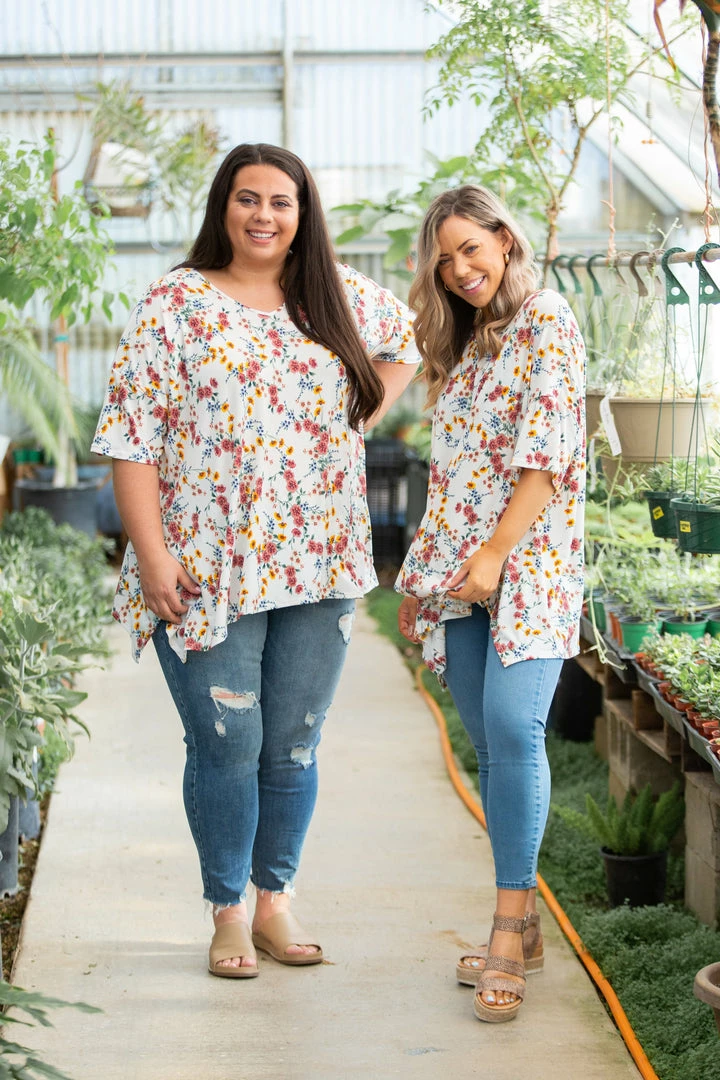 Spring showers bring May flowers and this gorgeous short sleeve top is as beautiful as those Spring blossoms. With a relaxed fit, this top features short sleeves, a v-neck and an asymmetrical sharkbite hem.