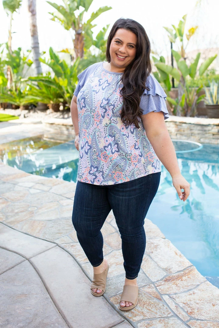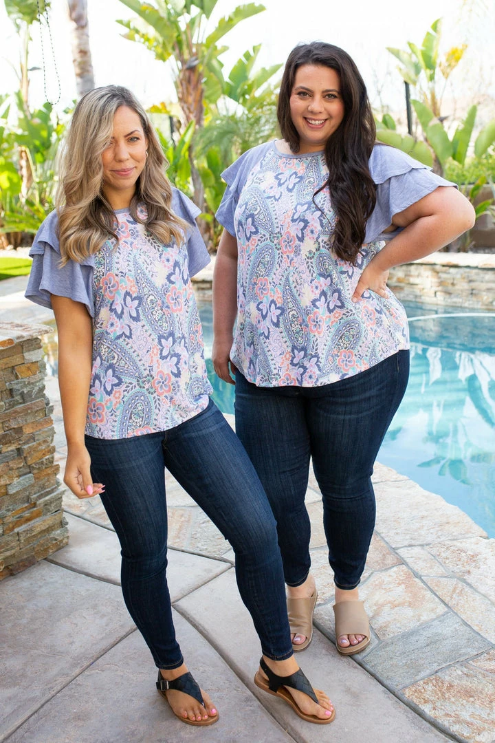 This stunning tiered bell sleeve top is the perfect colors for Spring. The denim, the pinks, the yellows, it’s so full of life! Made from a soft terry fabric, this top features a relaxed fit, round neckline, rounded hem and two-tier bell sleeves.