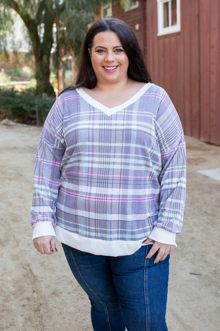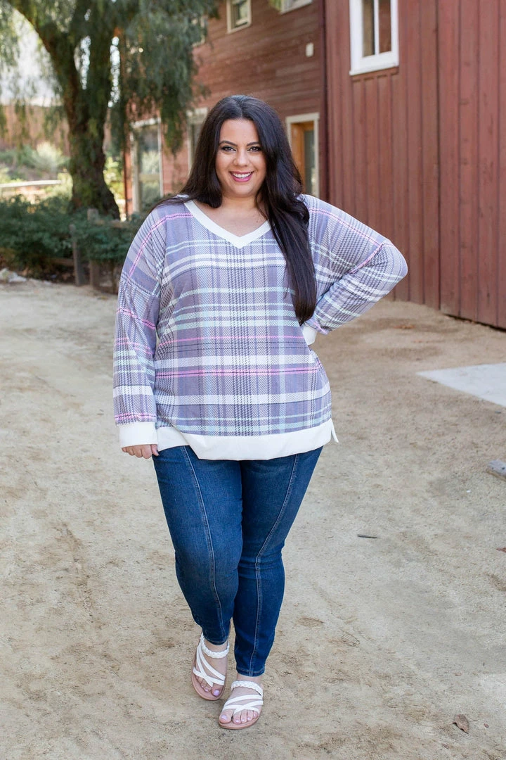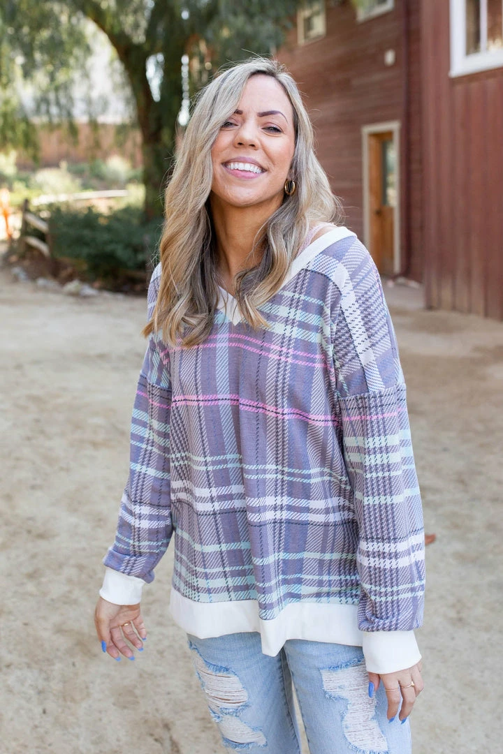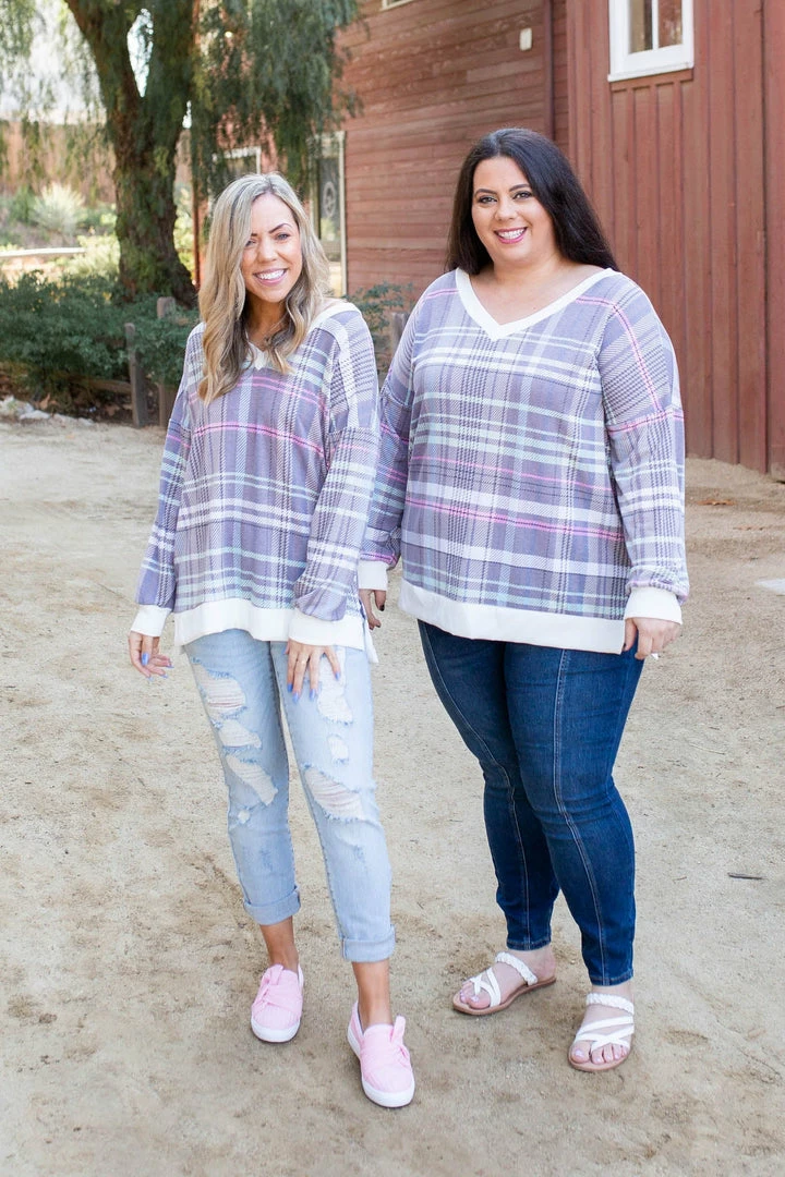 We are swooning over this plaid weekender, the colors are so perfect to transition into Spring with. Featuring a v-neck, banded sleeves and hi-lo hem, this weekender will be your next go to cover this season.