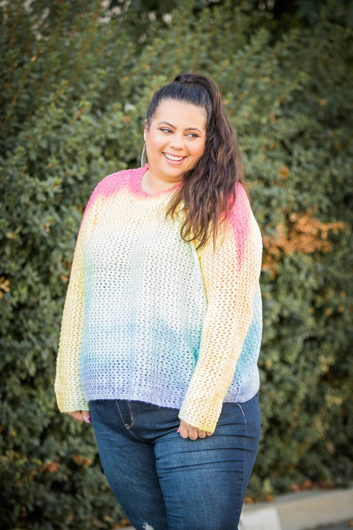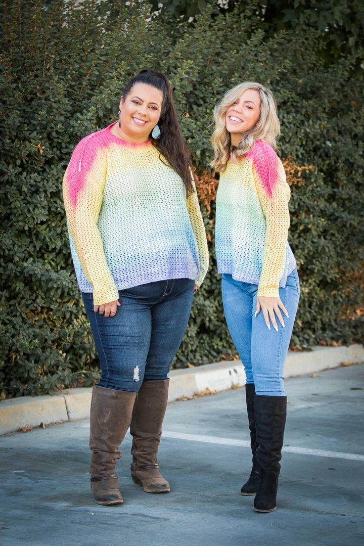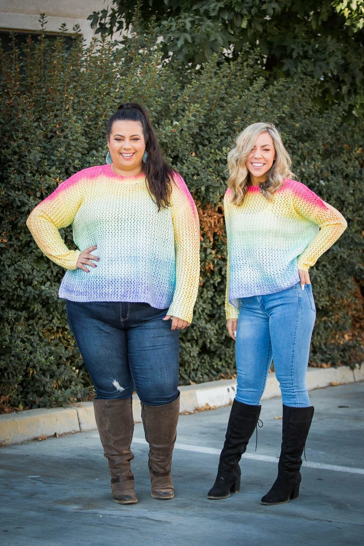 Starlite, Starbright, first sweater I want to wear tonight! This amazing rainbow colored knit sweater is not only gorgeous, but it’s also made from the softest knit. Featuring a round neckline long sleeves and cropped look, this sweater can be worn alone, or layered over a cami or flowy tee. .