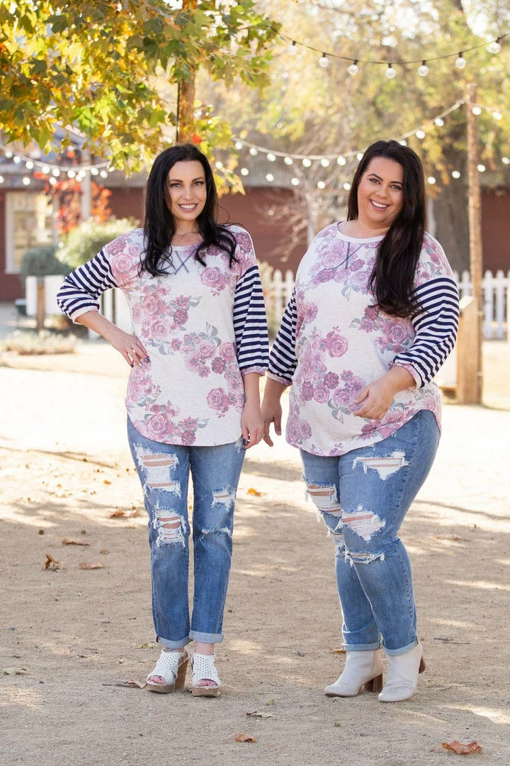 You won’t strike out with this gorgeous loose fitting baseball tee, it’s absolutely striking! The floral bodice and contrasting striped sleeves really give this top a unique, classy and fun look. Featuring long sleeves, round neckline and rounded hem.