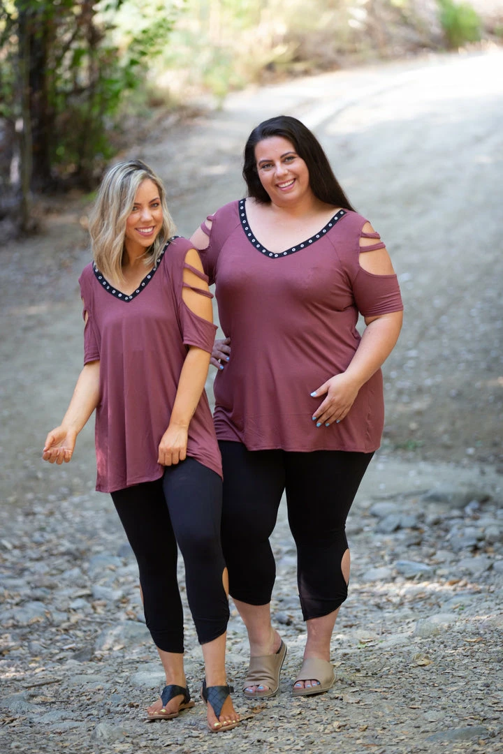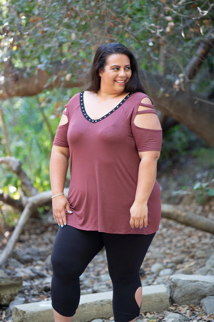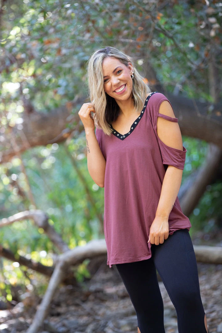 This short sleeve lattice top is absolutely striking! Made from a soft jersey fabric, this top features a relaxed fit, v-neck with eyelet detail and short raglan sleeves with lattice cutouts.