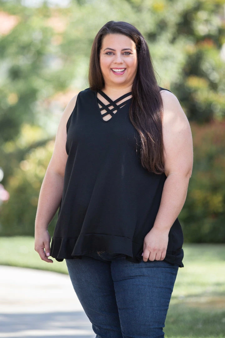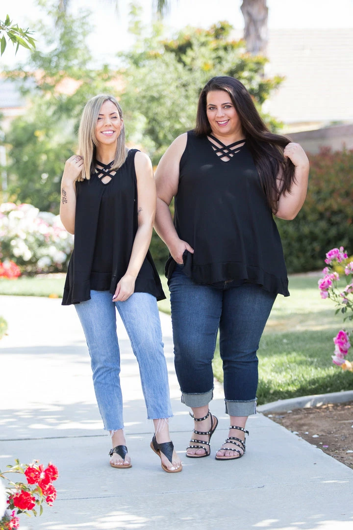 One can never have enough black tops, and this sleeveless top will add some great uniqueness to your wardrobe while being able to pair it with just about anything. With a relaxed fit, this top features a v-neck with criss cross detail and ruffled hem.