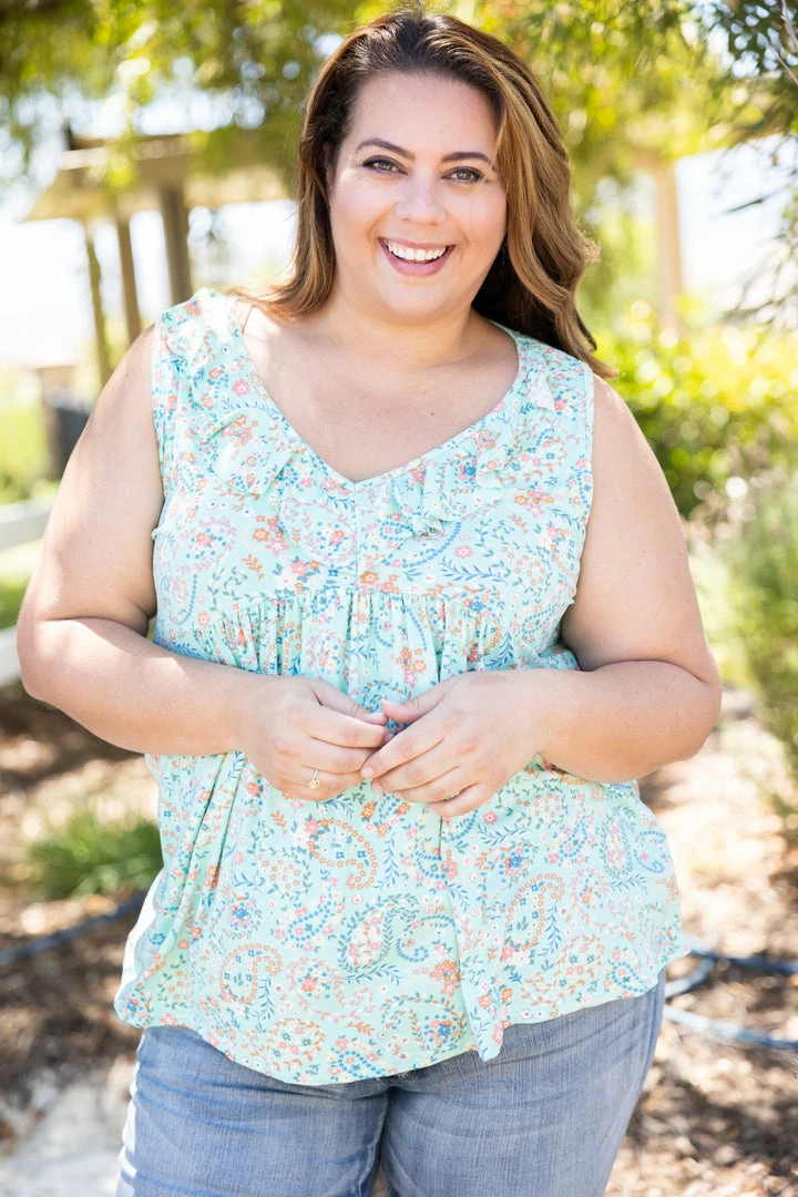 Made from the most buttery soft fabric, this sleeveless top has the perfect shades to transition into summer with. The mint background really makes the coral colored paisley print pop! With a relaxed fit, this top features a V-neck with ruffle detail, empire waist and rounded hem.