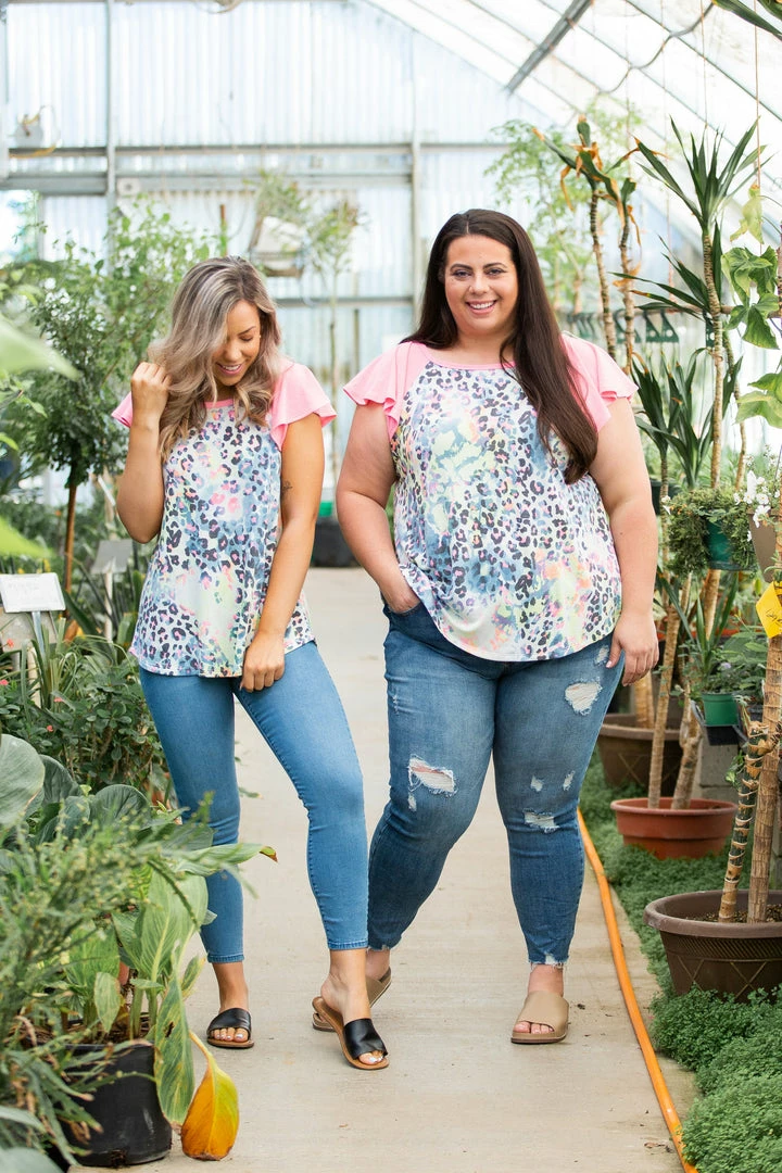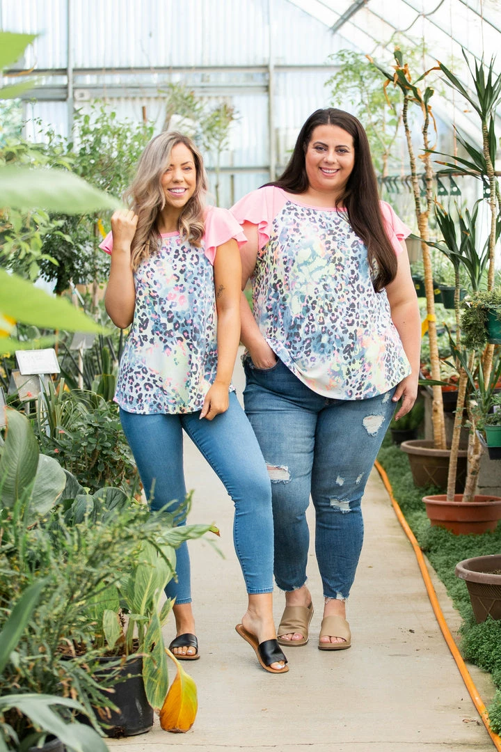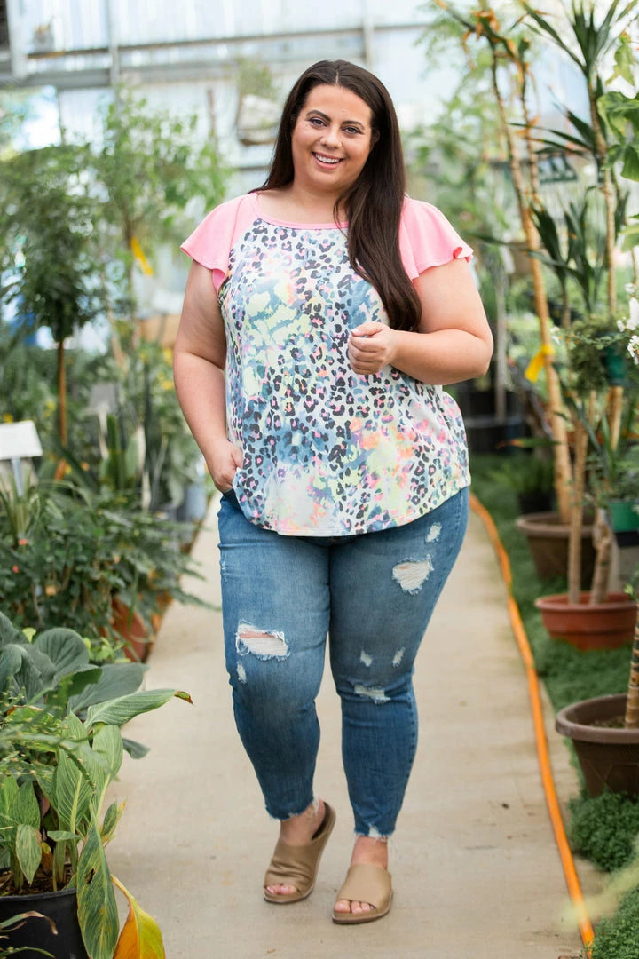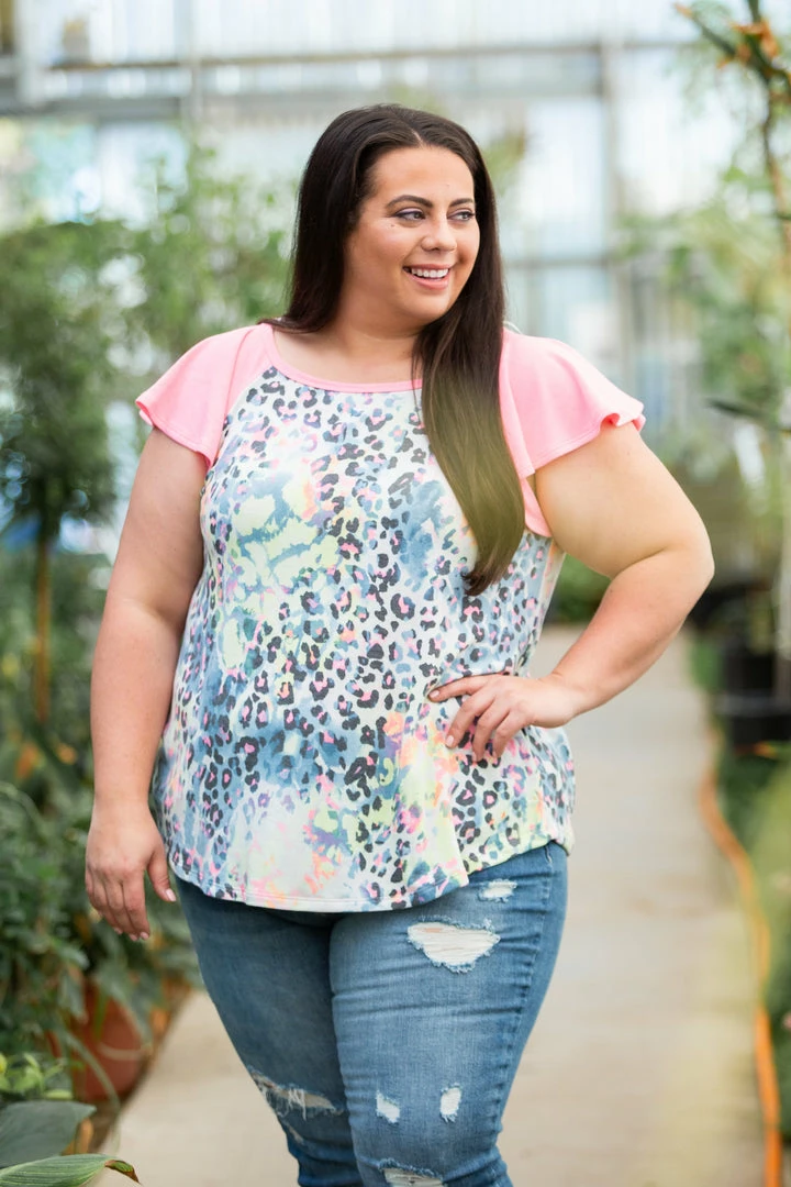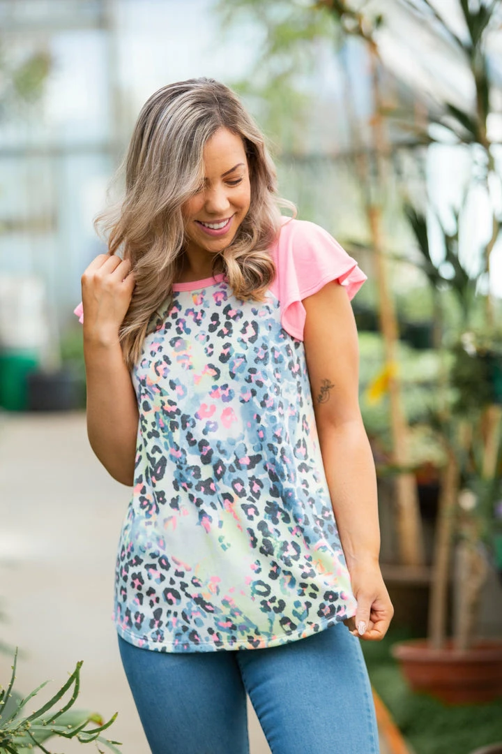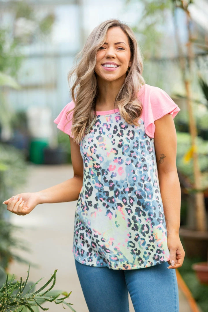 The neon colors in this gorgeous animal print short sleeve top are the perfect colors for a vibrant summer. Made from a terry fabric, this top features a relaxed fit, round neckline and short flutter sleeves.