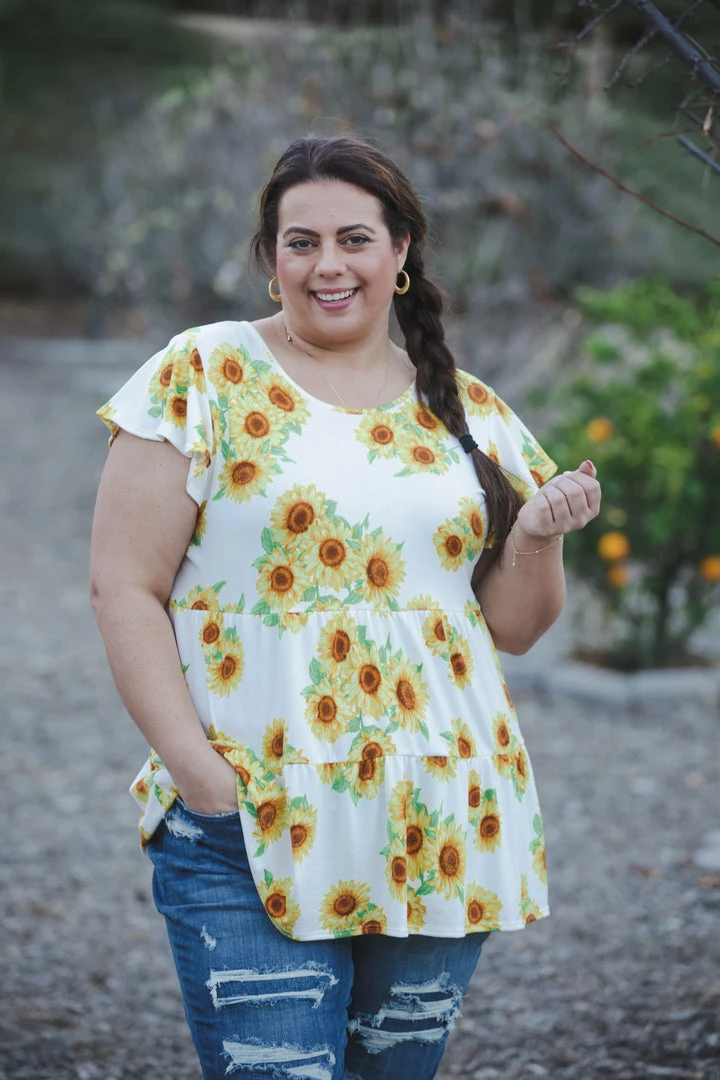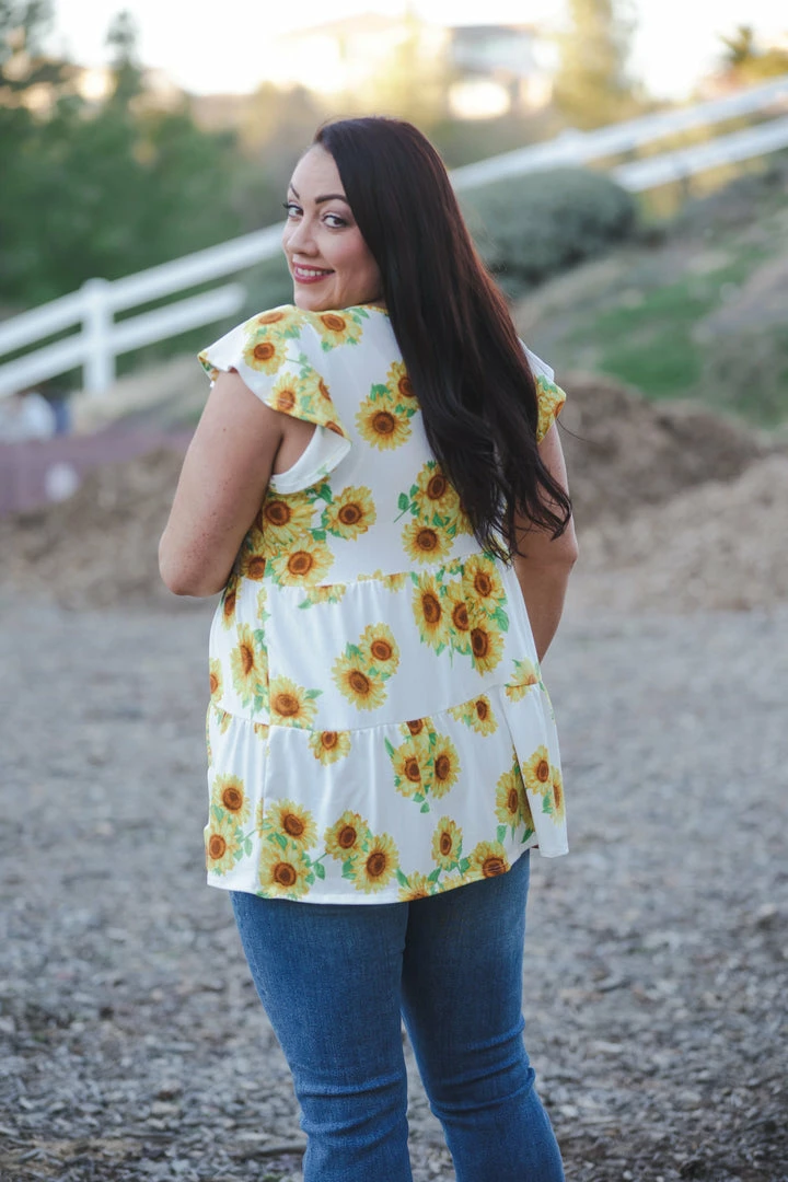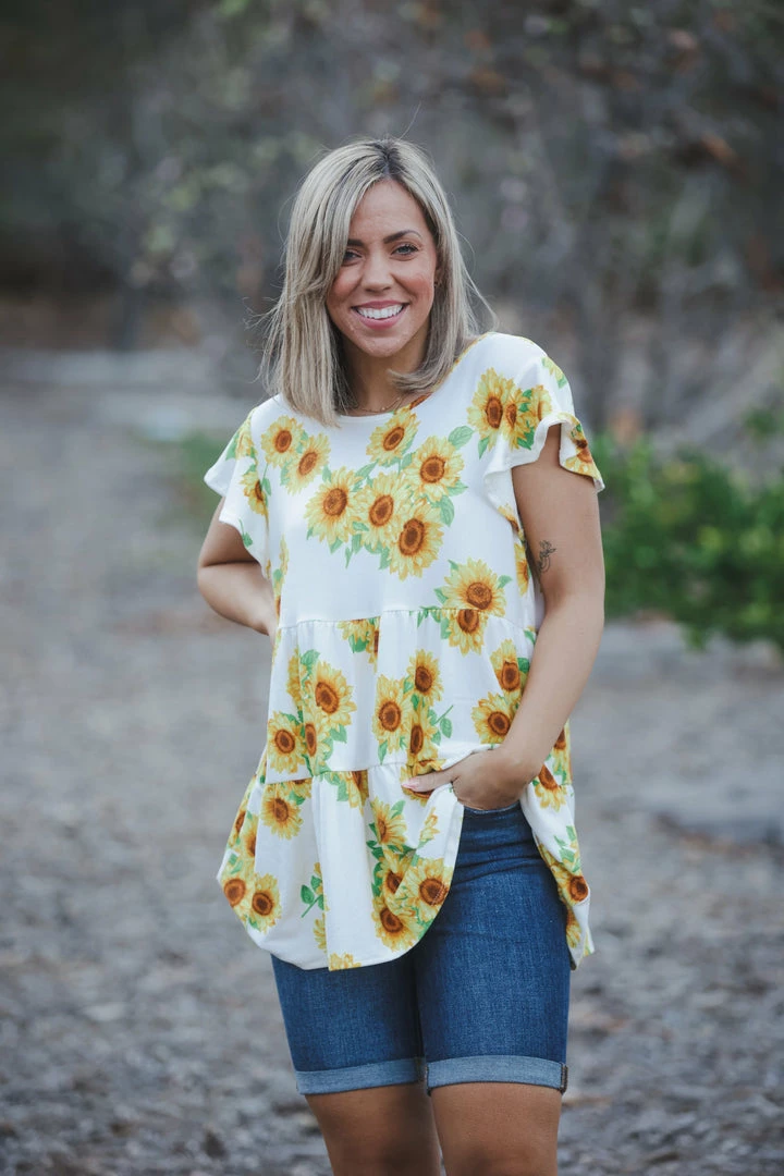 We can’t get over how amazing this sunflower tiered tunic is! Made from a lightweight jersey fabric, this top features a round neckline, short flutter sleeves and tiered hem.