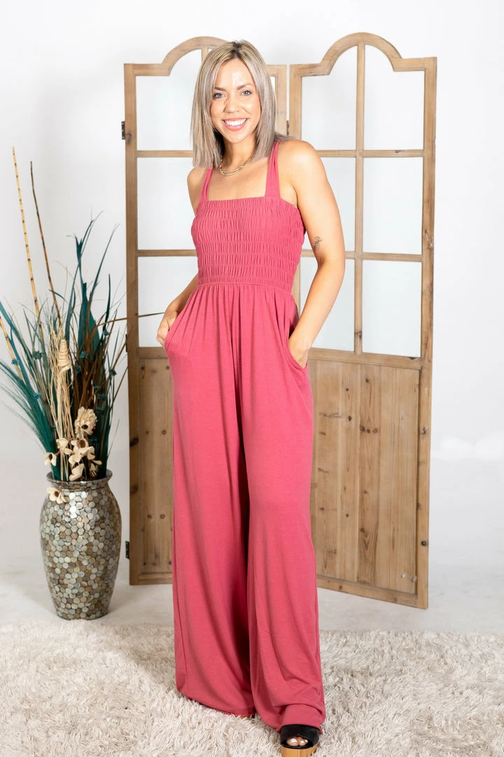 You will never want another jumper after this one, it is absolute perfection. The deep rose color is the perfect shade of pink. Featuring a smocked bodice and wide legs give such a flattering look on all and side pockets! .