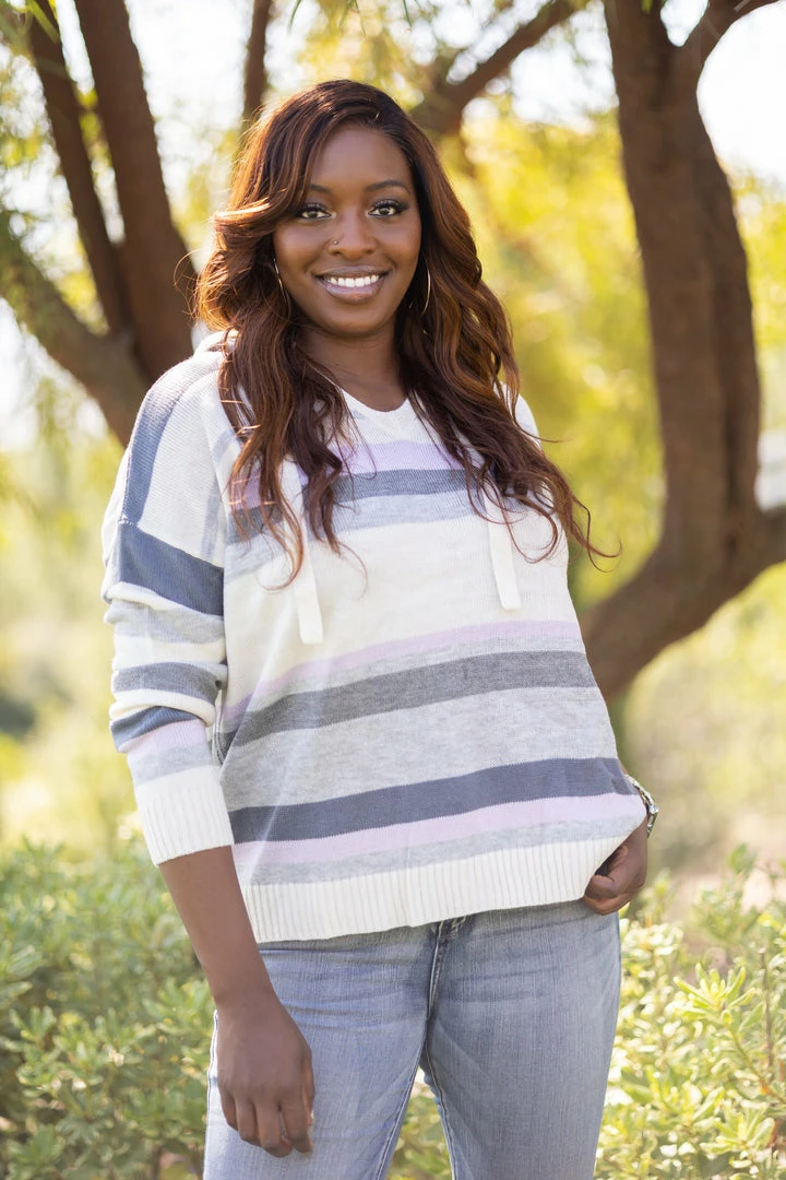 This lavender striped hoodie, is the perfect spring and summer pullover. Made from a light weight knit, this hoodie features long sleeves, v-neck and adjustable strings for the hood.