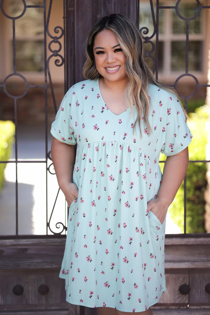 The sweet simplicity of those little flowers on this mint dress is as close to perfect as it gets. With a relaxed fit, this dress features a v-neck, short dolman sleeves, empire waist and side pockets!