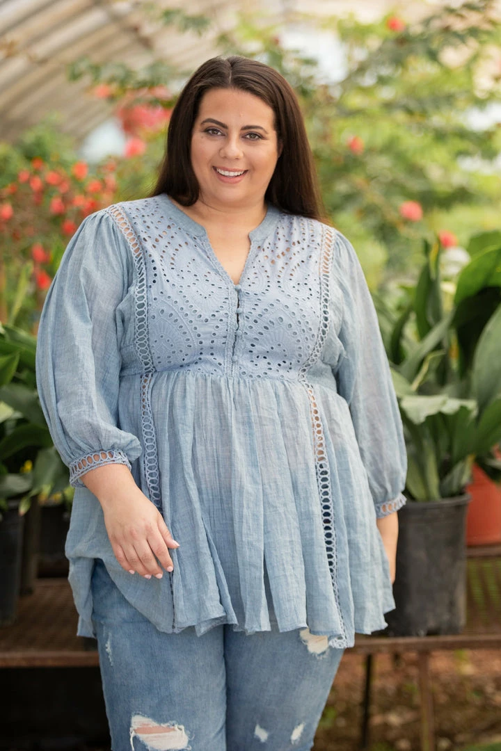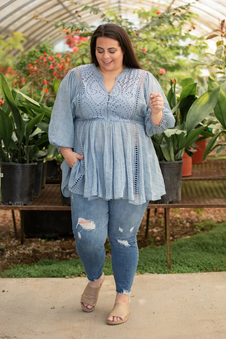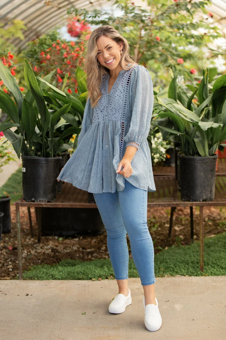 This high end woven blouse will be your go to when you’re out and about. The lightweight fabric is perfect for those warmer months, and the interior lining on the chest makes this top so easy to wear. With a relaxed fit, this tunic length top features a v-neck with functioning button details, lace trim and 3/4 sleeves.