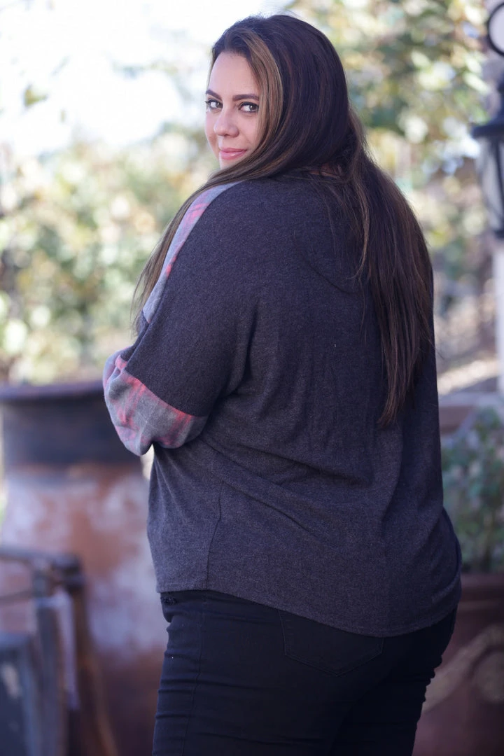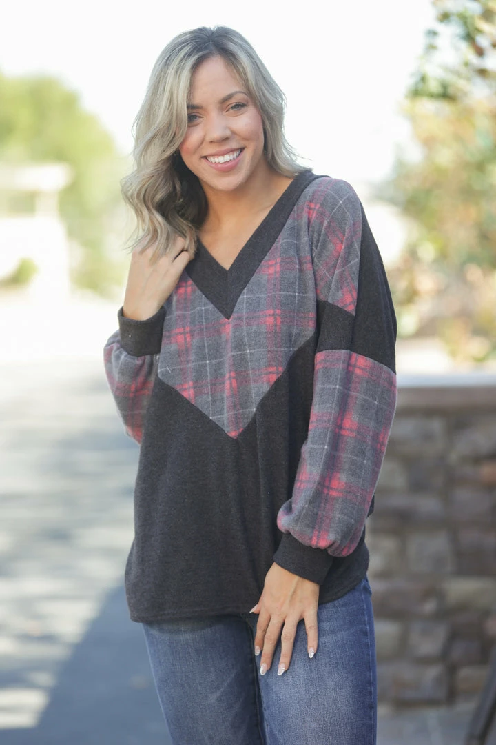 If you’re looking for a sweater that’s as soft as unicorn fur, look no further. This brushed hacci sweater feels just like cashmere…soooo soft! Featuring long bubble sleeves and plaid chevron color blocking, this sweater is absolutely perfect in every way.