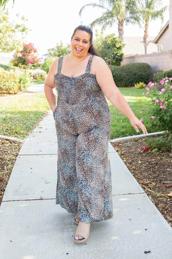 You will never want another jumper after this one, it is absolute perfection. The colors and pattern is absolutely perfect to transition into fall with. Featuring a smocked bodice and wide legs give such a flattering look on all and side pockets!