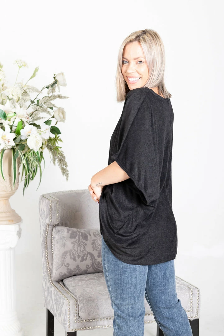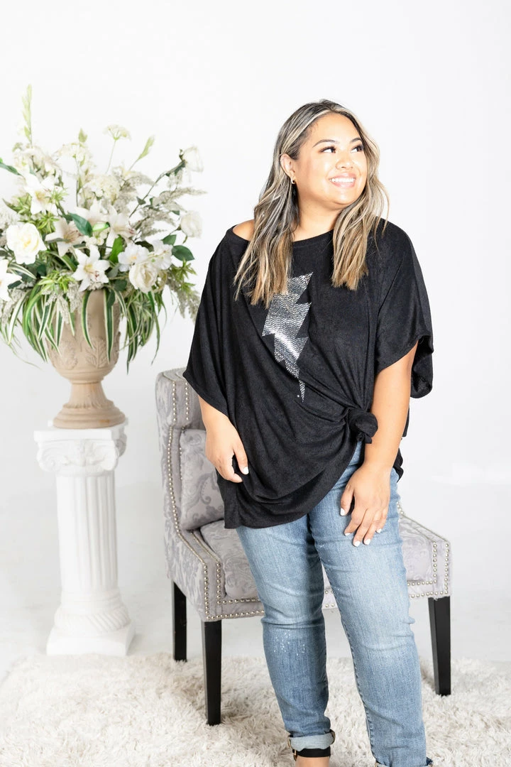 We are loving this oversized knit boxy tee! What a perfect transitioning piece?! With a super relaxed fit (you can easily size down), this top features a sequin lightning bold, round neckline and short dolman sleeves.