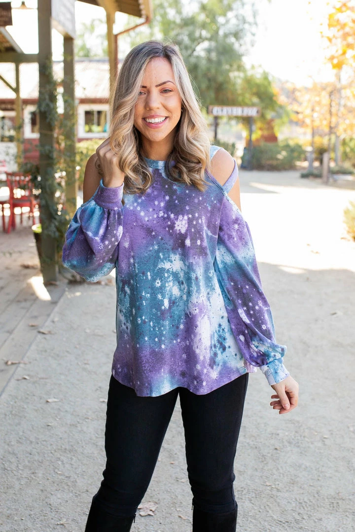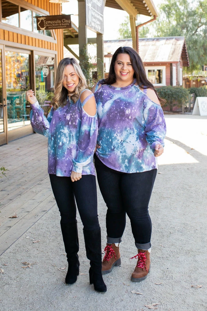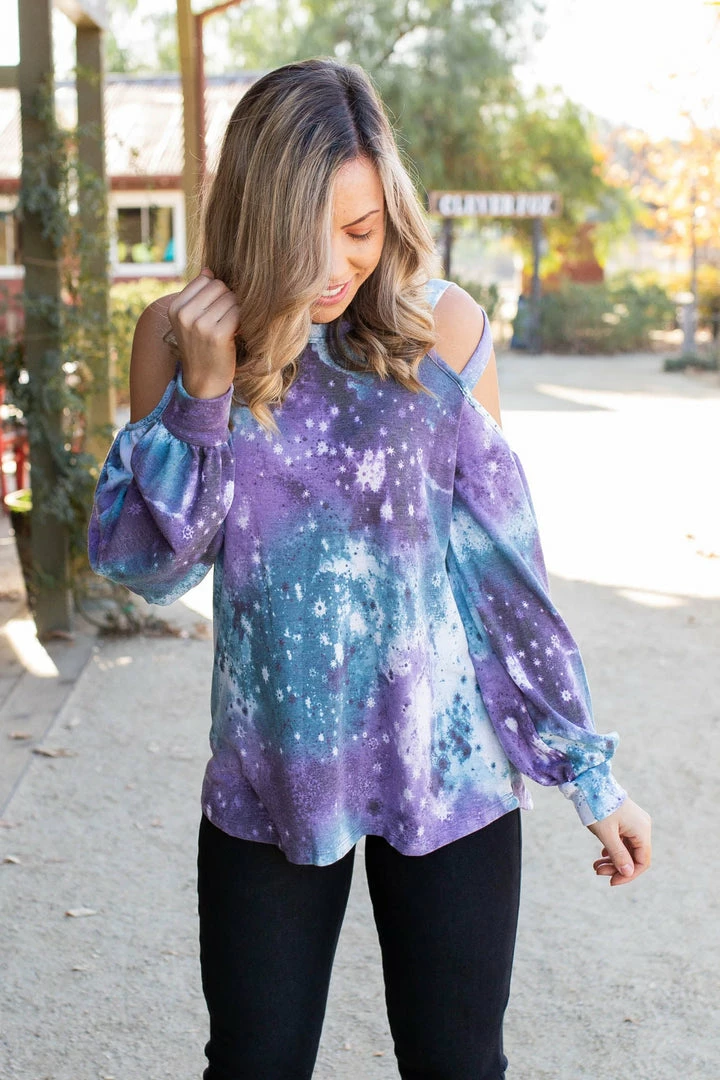 We love this galaxy tie dye printed top all the way to the moon and back. With a relaxed fit, this french terry knit top features caged shoulder details, long sleeves and a round neckline.