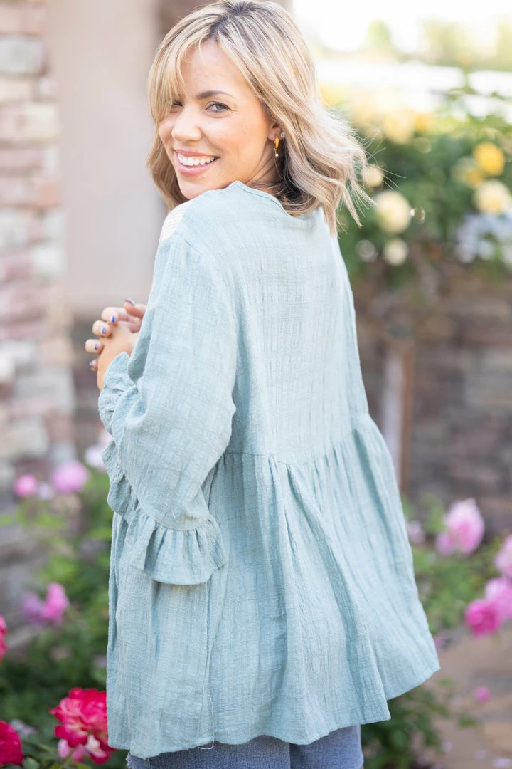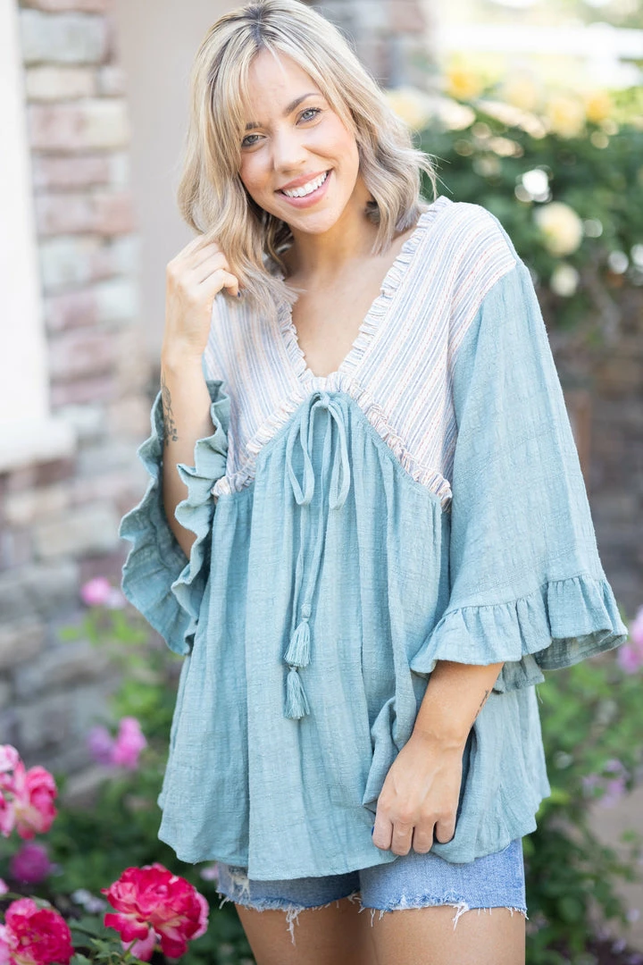 This woven 3/4 sleeve top has the ultimate vintage feel, and it’s giving us all those good feels. With a relaxed fit, this top features a v-neck with ruffle trim and 3/4 ruffle hem sleeves.