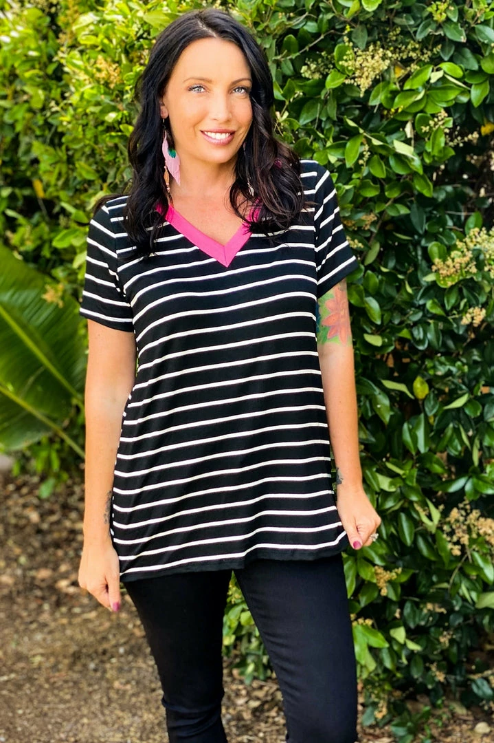 The love for this top is unreal. Not only are black and white stripes a classic look, but the touch of pink on the v-neck collar really makes this top pop!